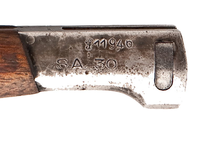 Mat grijs geverfde exemplaren kunnen gelinkt worden aan de Belgische defensie omdat deze oppervlaktebehandeling toegepast werd in het arsenaal van Rocourt bij een volledige revisie van de vuur- en blanke wapens. Deze kleur is niet specifiek voor de Belgische marine.