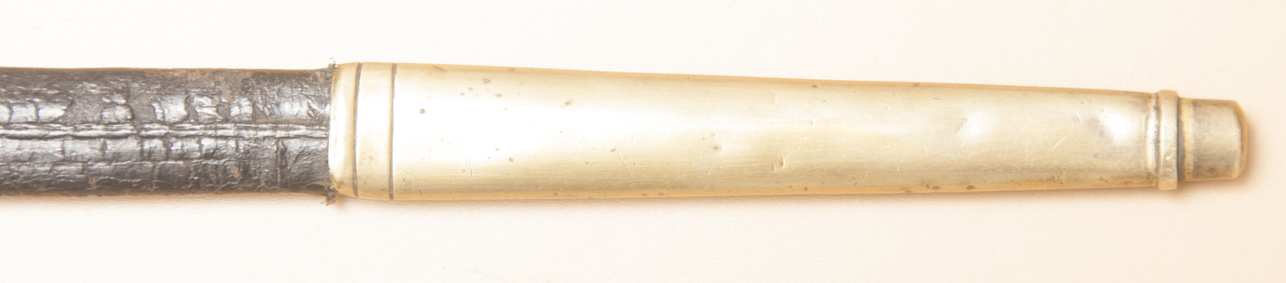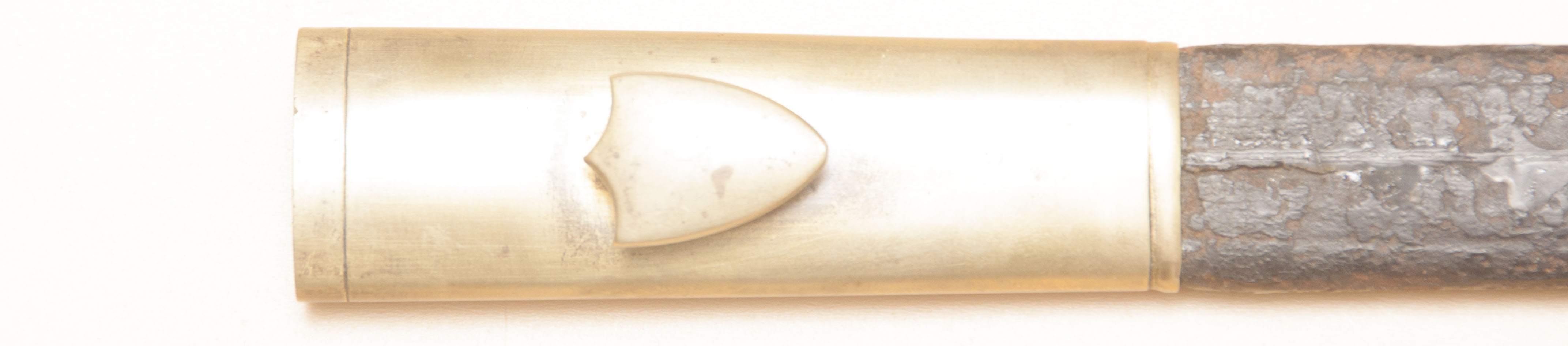 De punt van de schede had een messing beslag met een rechte bovenste boord voorzien van twee decoratieve lijnen.
