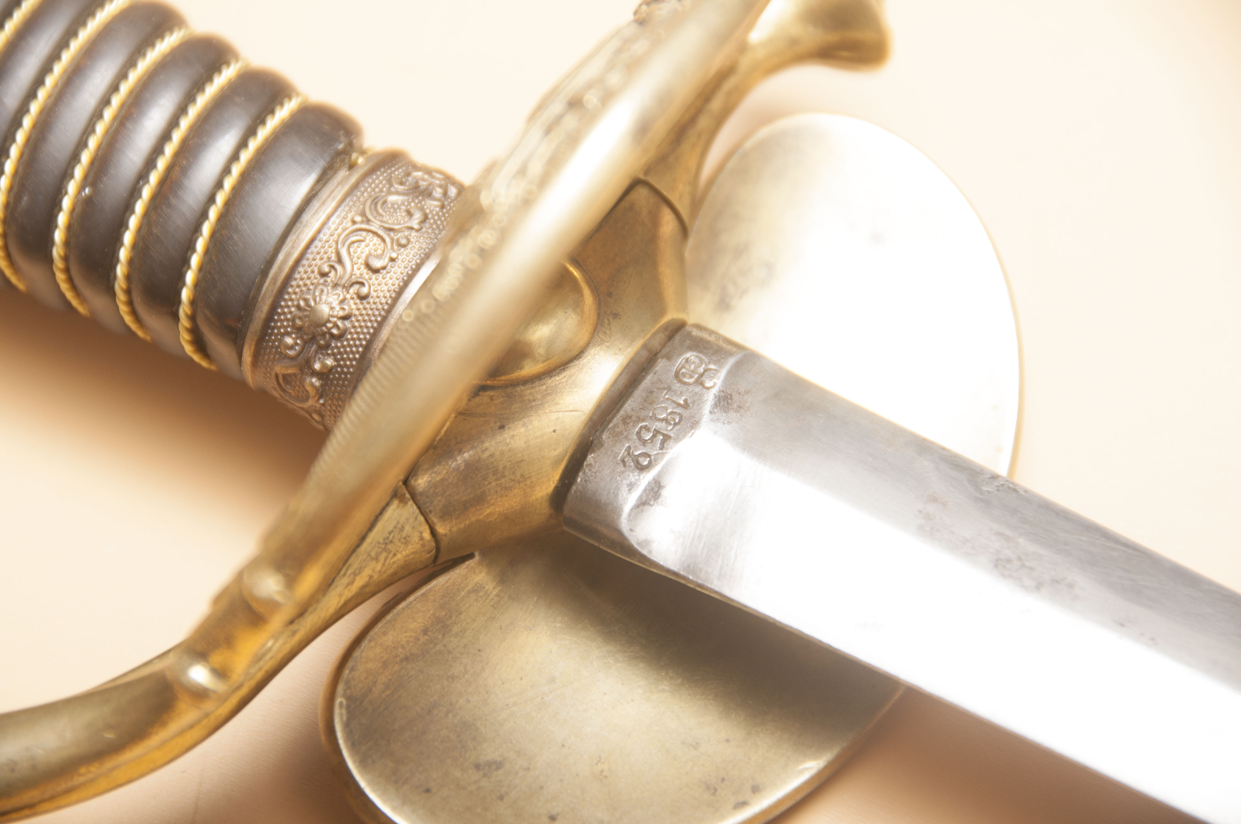 Het heft bestond uit één stuk gegoten messing. De garde had een enkele beugel, met zowel aan de achterkant als in het midden een decoratieve bloemvorm. De garde eindigde in een naar voren gebogen pareerstang met leeuwenkop.
