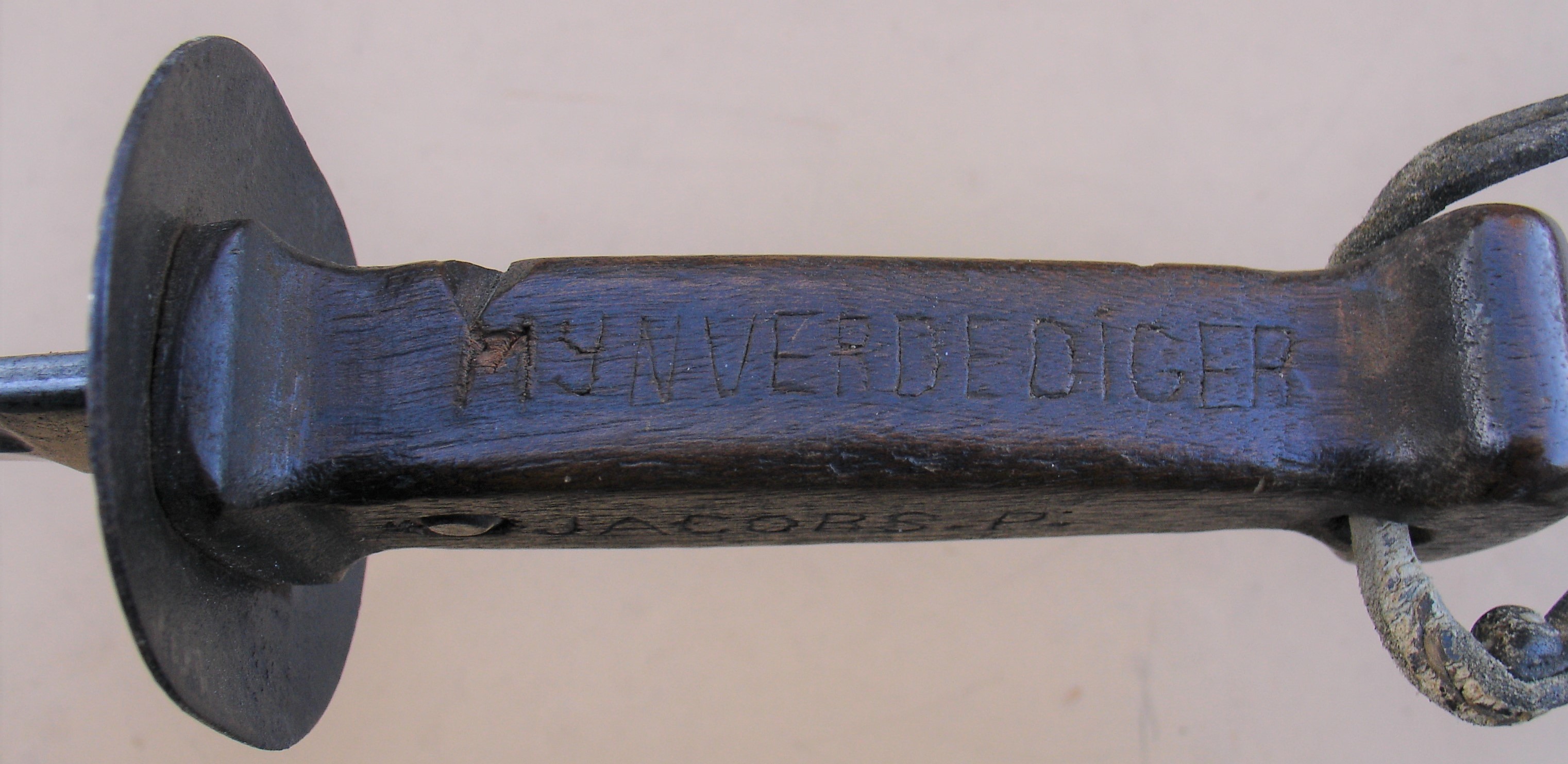 Het heft werd gemaakt uit een simpel maar stevig stuk notenhout dat over het resterende gedeelte van de tang paste. Beiden werden vastgemaakt door middel van een stalen rivet met messing rondel net achter de garde. De garde bestond uit een ovaal uitgesneden stuk plaatstaal. Deze werd op zijn plaats gehouden door het lemmet. Achteraan het heft was een opening voor een lederen veter die om de pols van de gebruiker paste.