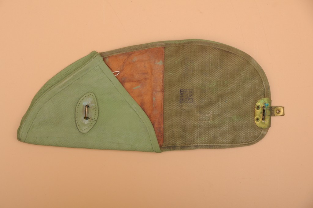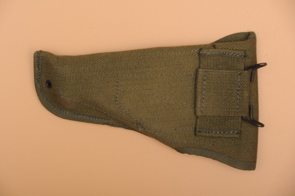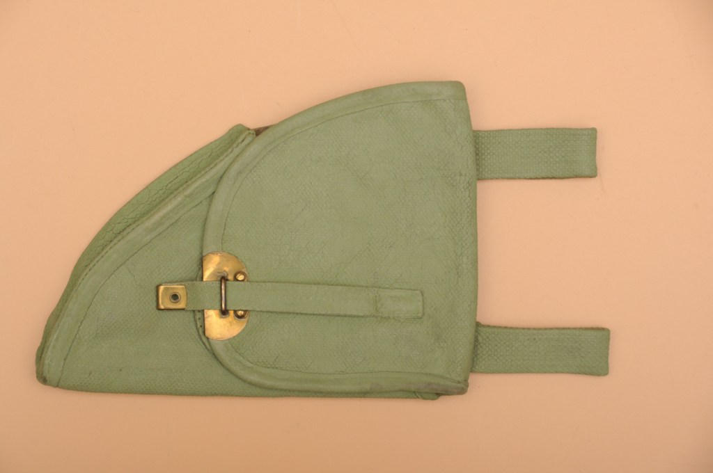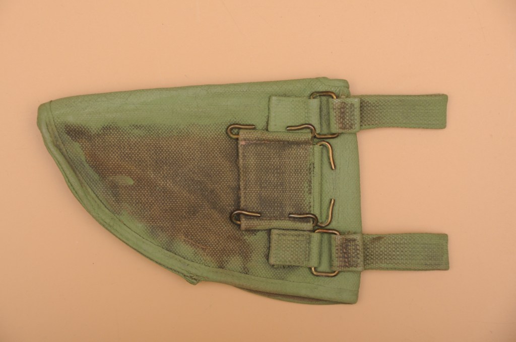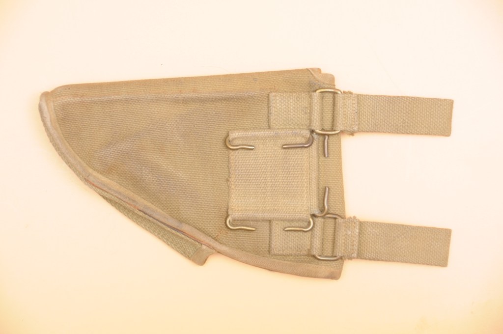 Groene verf aangebracht over initieel groen webbing, 170mm breed en 220mm hoog, dubbele 25mm brede riemlussen aan de achterkant en metalen riembeugels, sluiting van boven naar beneden doorheen een messing beugel, messing beslag met 2 rivetten op het uiteinde van de flap en messing uiteinde van de sluitingsriem met 1 open rivet, 1 vak voor reservelader aan de binnenkant, met ruimte voor poetsstok.