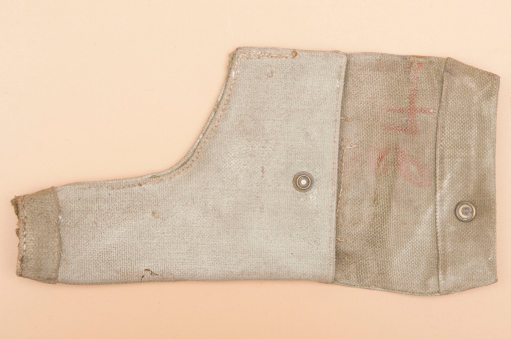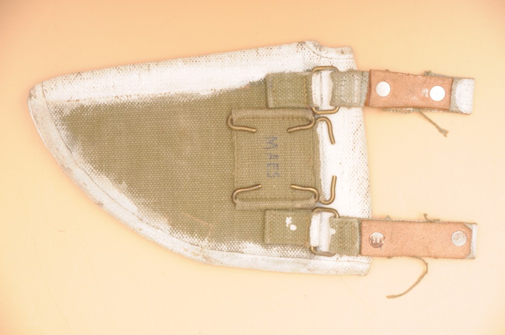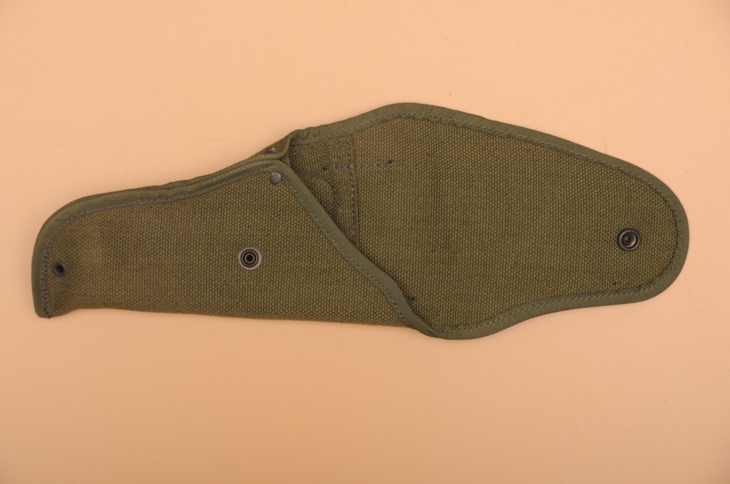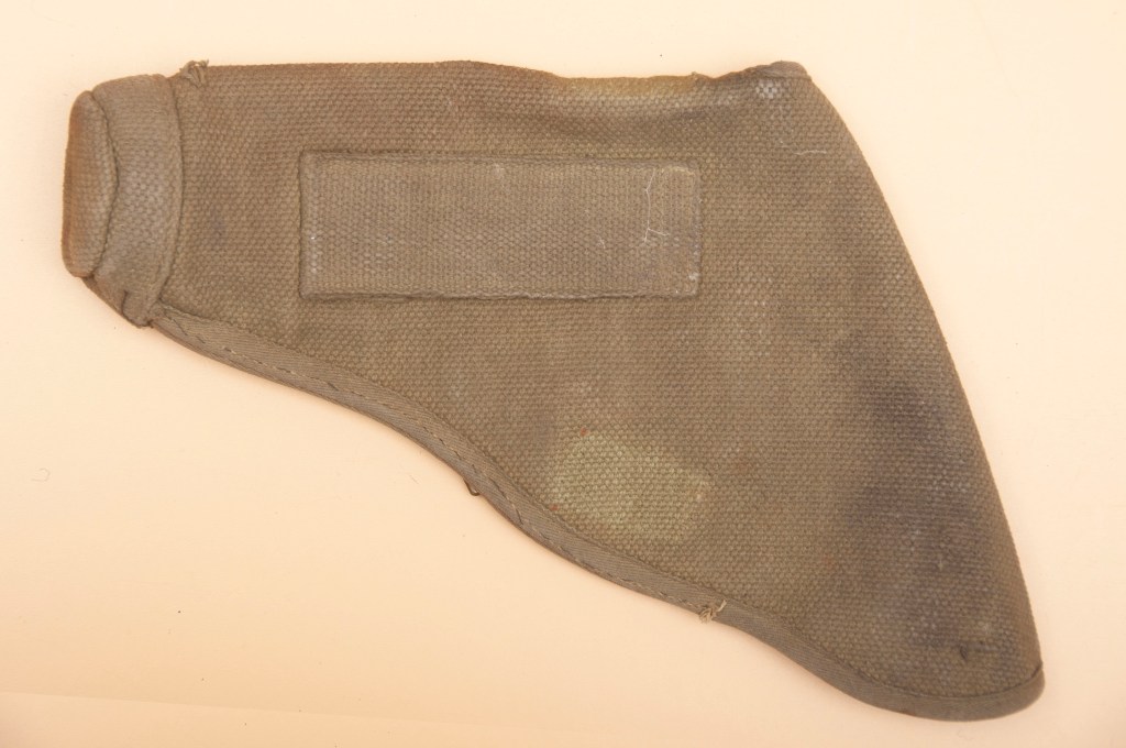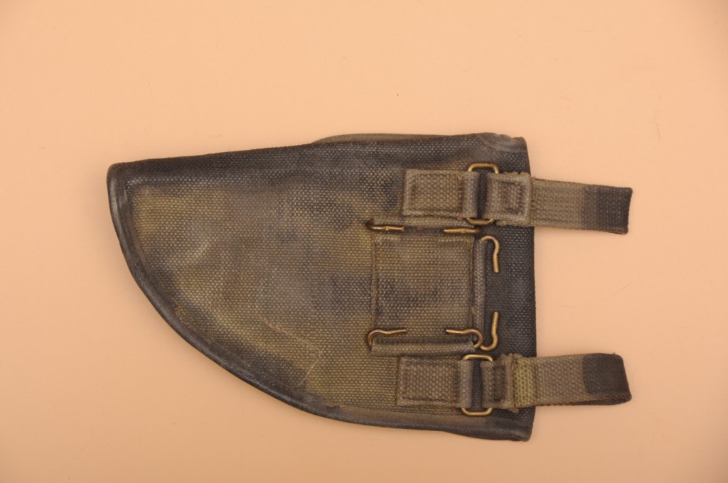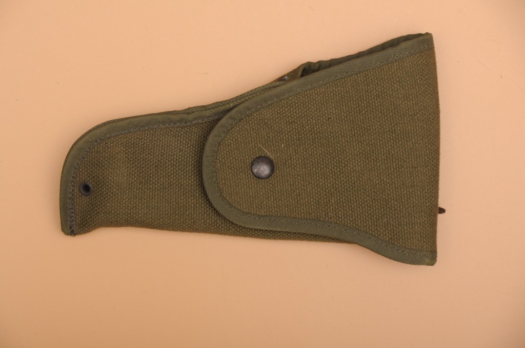 Groene verf aangebracht over initieel groen webbing, 170mm breed en 220mm hoog, dubbele 25mm brede riemlussen aan de achterkant en metalen riembeugels, sluiting van boven naar beneden doorheen een messing beugel, messing beslag met 2 rivetten op het uiteinde van de flap en messing uiteinde van de sluitingsriem met 1 open rivet, 1 vak voor reservelader aan de binnenkant, met ruimte voor poetsstok.