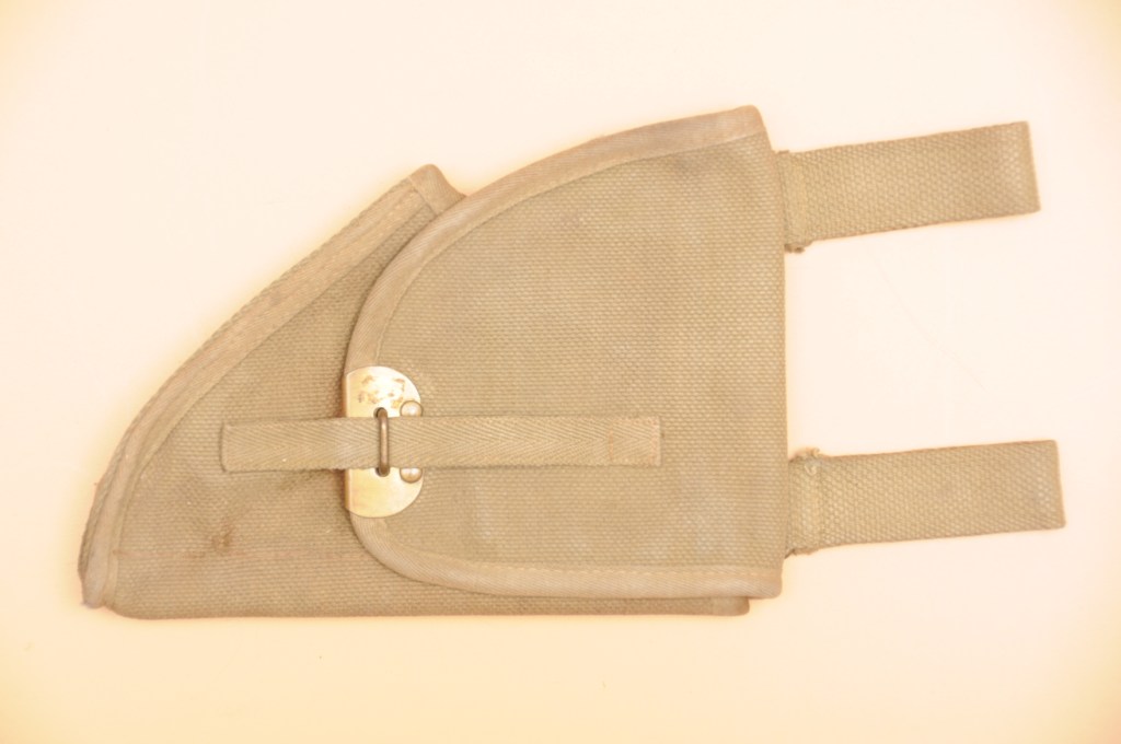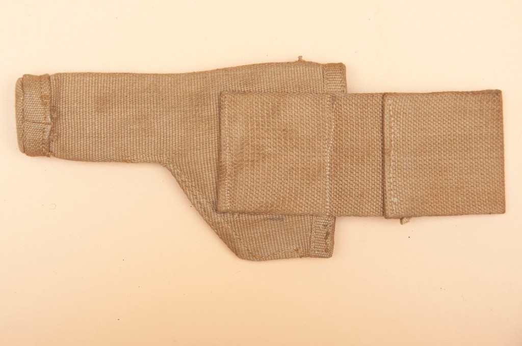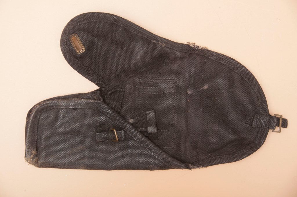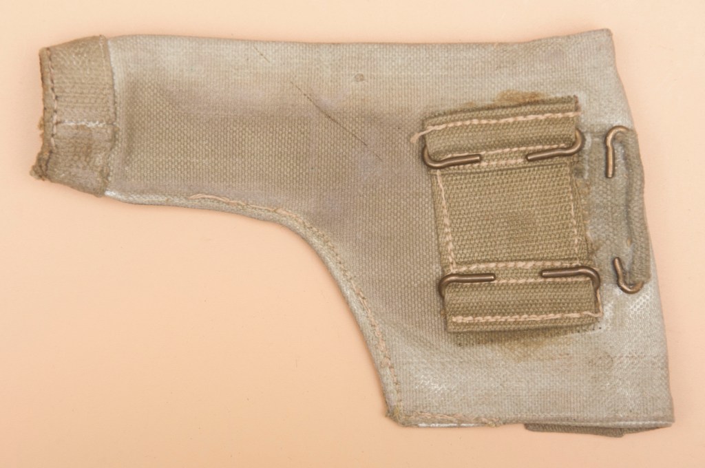Gezwart webbing dat initieel groen was, 180mm breed en 240mm hoog, 50mm brede riemlus aan de achterkant, sluiting van boven naar beneden doorheen een messing beugel, 1 vak voor reservelader aan de binnenkant, met ruimte voor poetsstok.