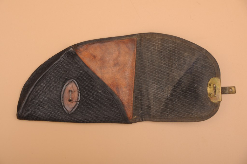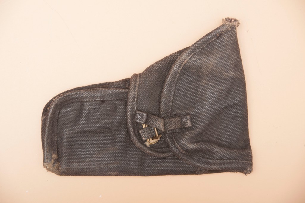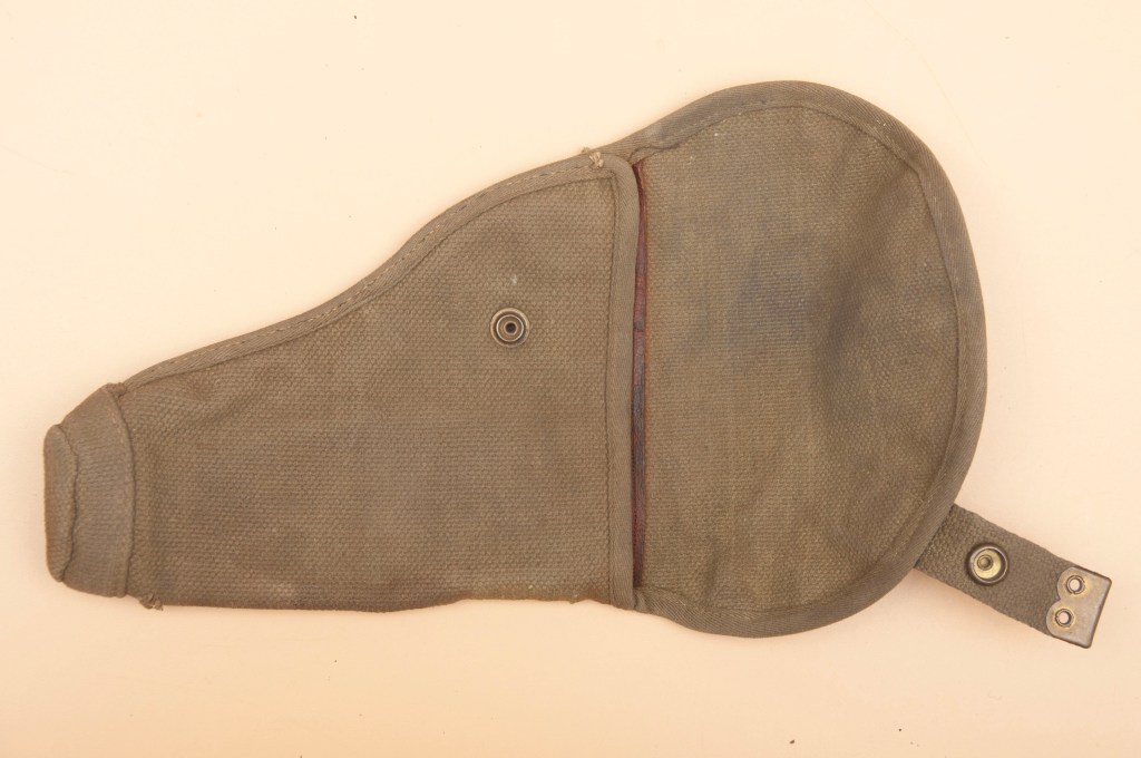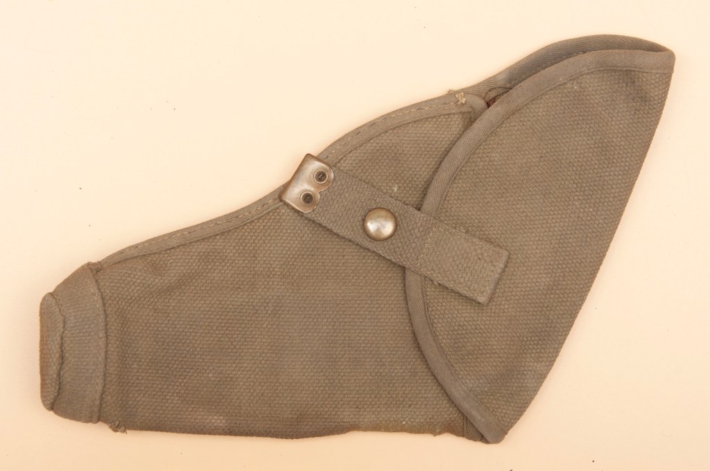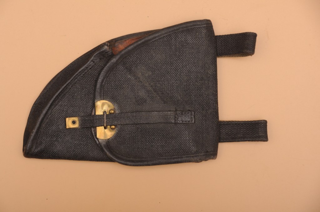 Gezwart webbing dat initieel groen was, 180mm breed en 240mm hoog, 50mm brede riemlus aan de achterkant, sluiting van boven naar beneden doorheen een messing beugel, 1 vak voor reservelader aan de binnenkant, met ruimte voor poetsstok.