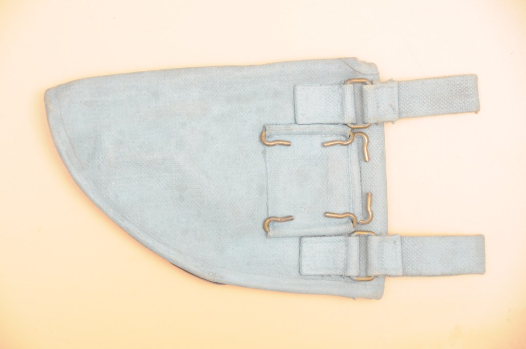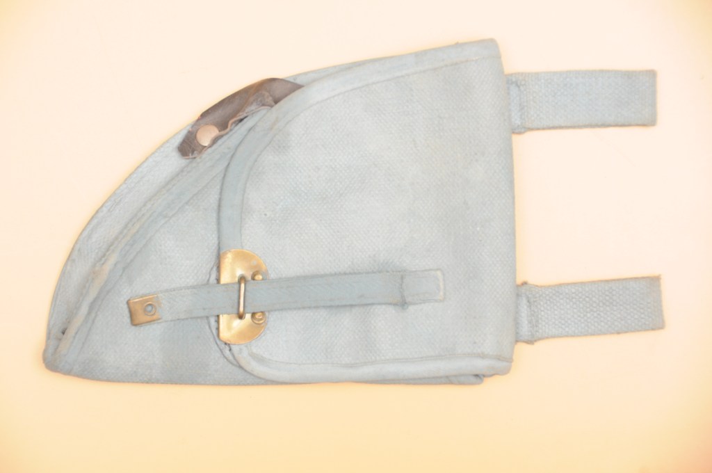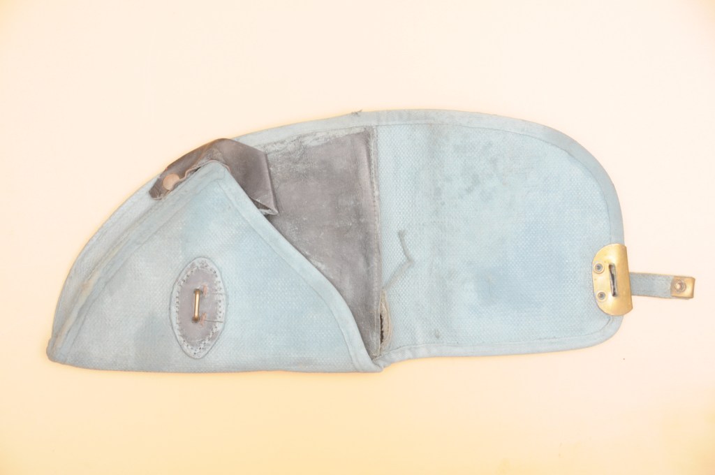 Lichtblauw webbing, 160mm breed en 220mm hoog, dubbele 25mm brede riemlussen aan de achterkant, sluiting van boven naar beneden doorheen een messing beugel, messing beslag met 2 rivetten op het uiteinde van de flap en messing uiteinde van de sluitingsriem met 1 open rivet, 1 vak voor reservelader aan de binnenkant, met ruimte voor poetsstok.