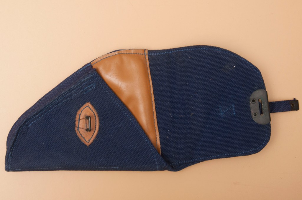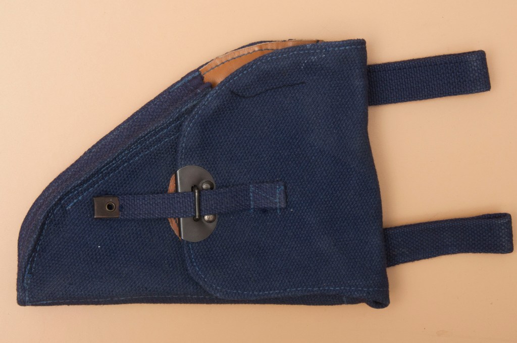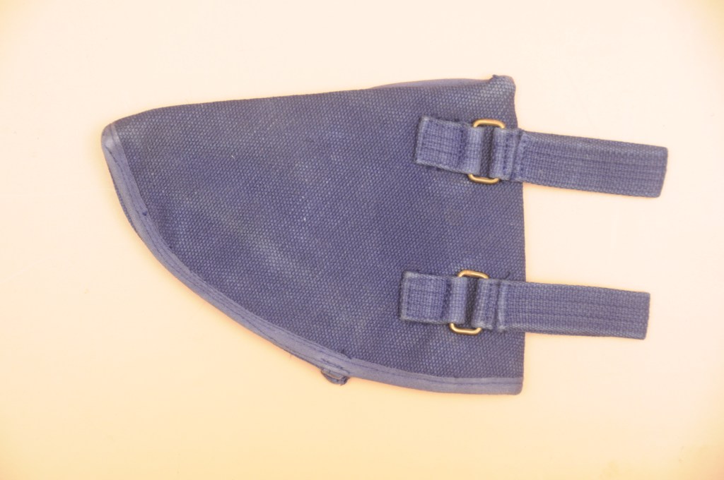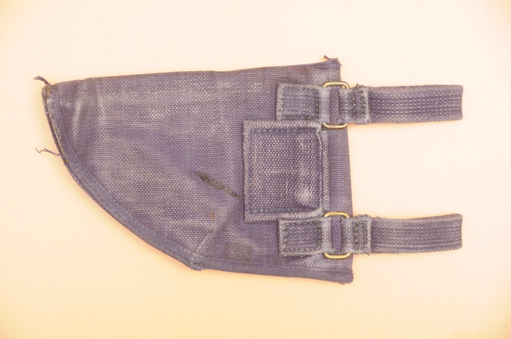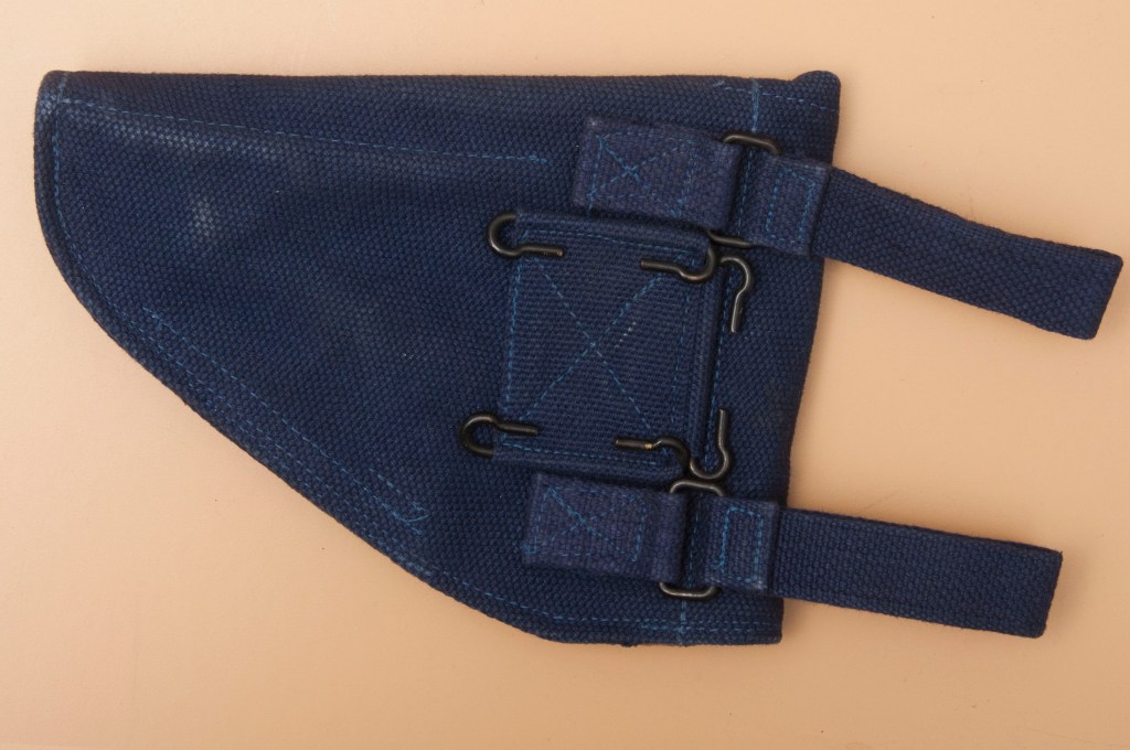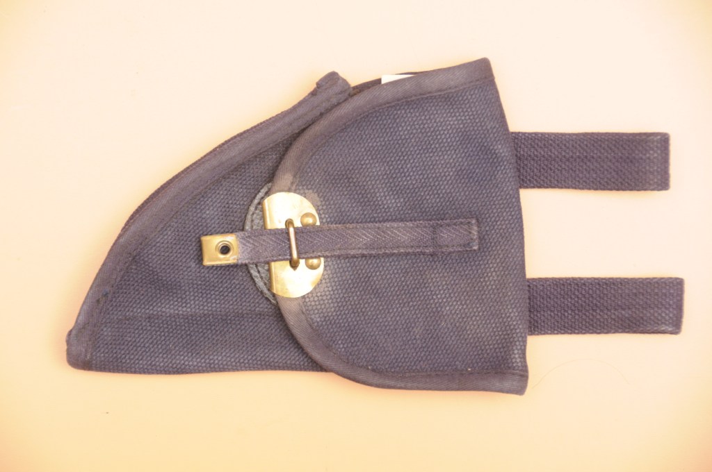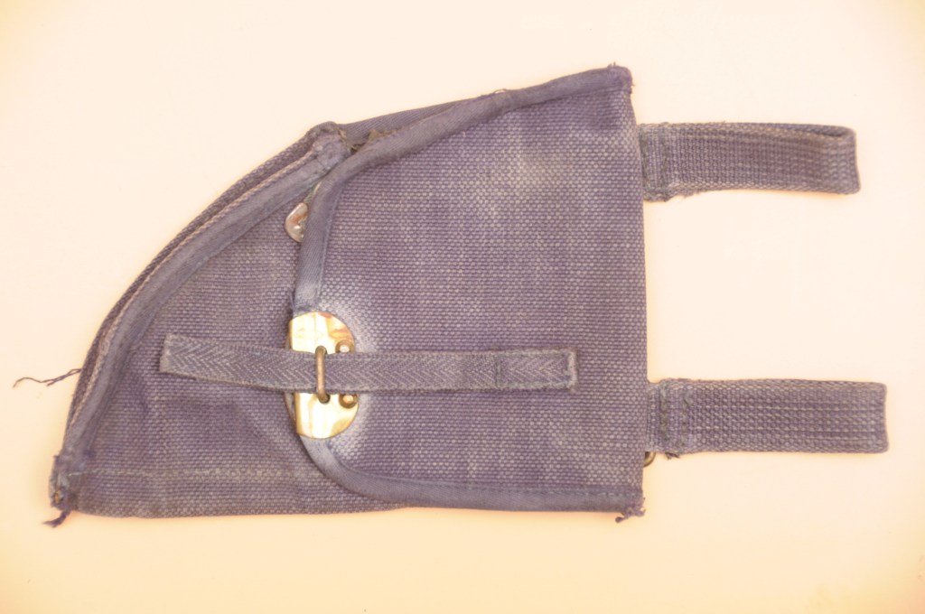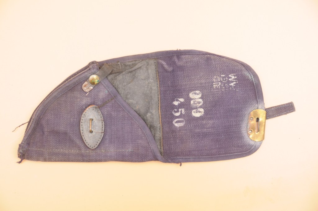Donkerblauw webbing, 145mm breed en 200mm hoog, dubbele 25mm brede riemlussen aan de achterkant, sluiting van boven naar beneden doorheen een messing beugel, messing beslag met 2 rivetten op het uiteinde van de flap en messing uiteinde van de sluitingsriem met 1 open rivet, 1 vak voor reservelader aan de binnenkant, met ruimte voor poetsstok.