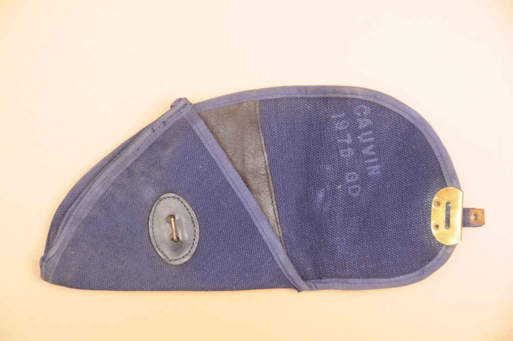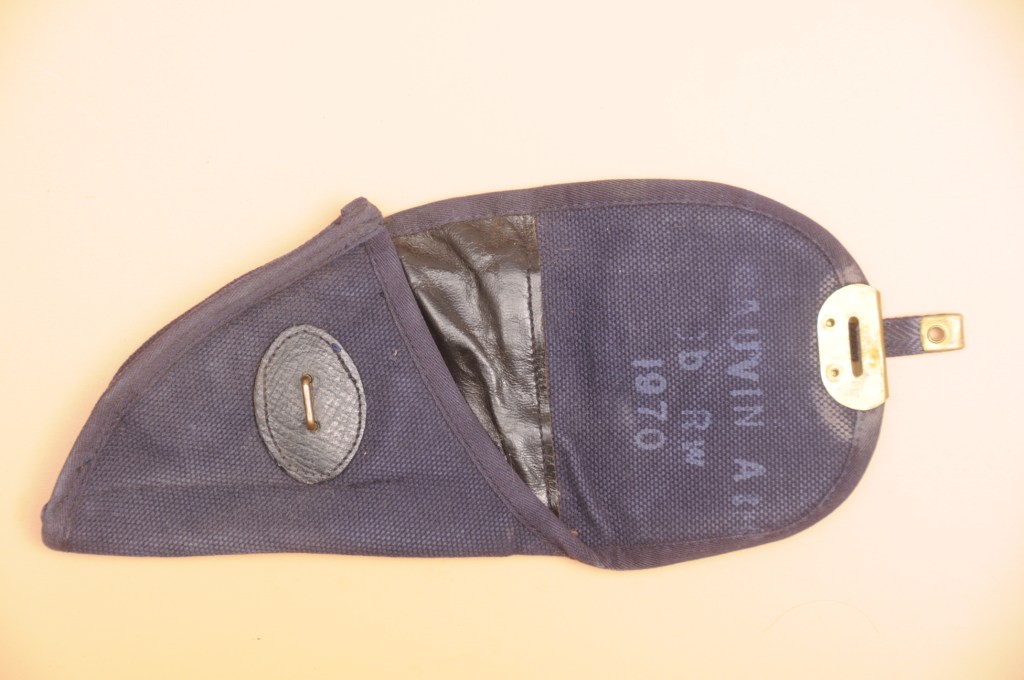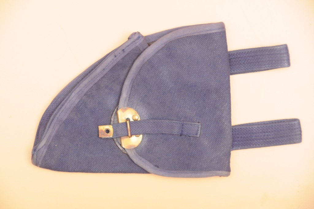 Donkerblauw webbing, 170mm breed en 220mm hoog, dubbele 25mm brede riemlussen aan de achterkant, sluiting van boven naar beneden doorheen een messing beugel, messing beslag met 2 rivetten op het uiteinde van de flap en messing uiteinde van de sluitingsriem met 1 open rivet, 1 vak voor reservelader aan de binnenkant, met ruimte voor poetsstok.