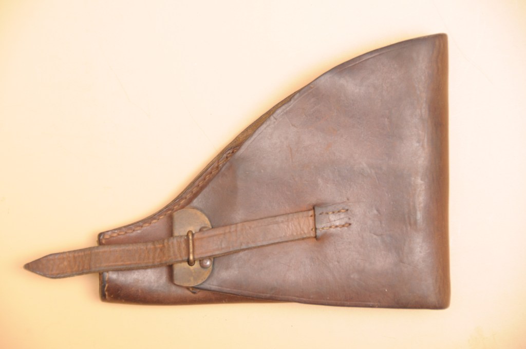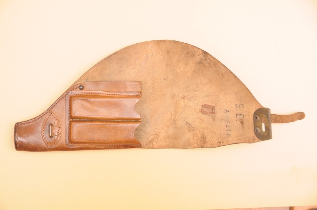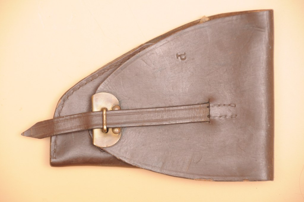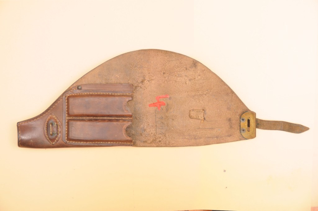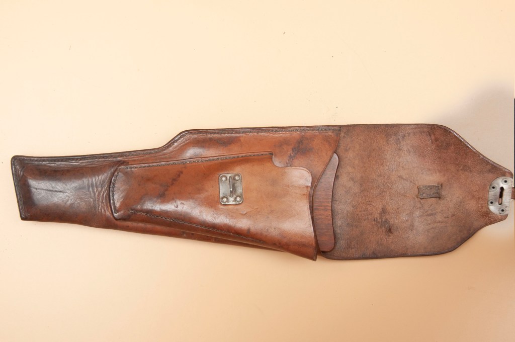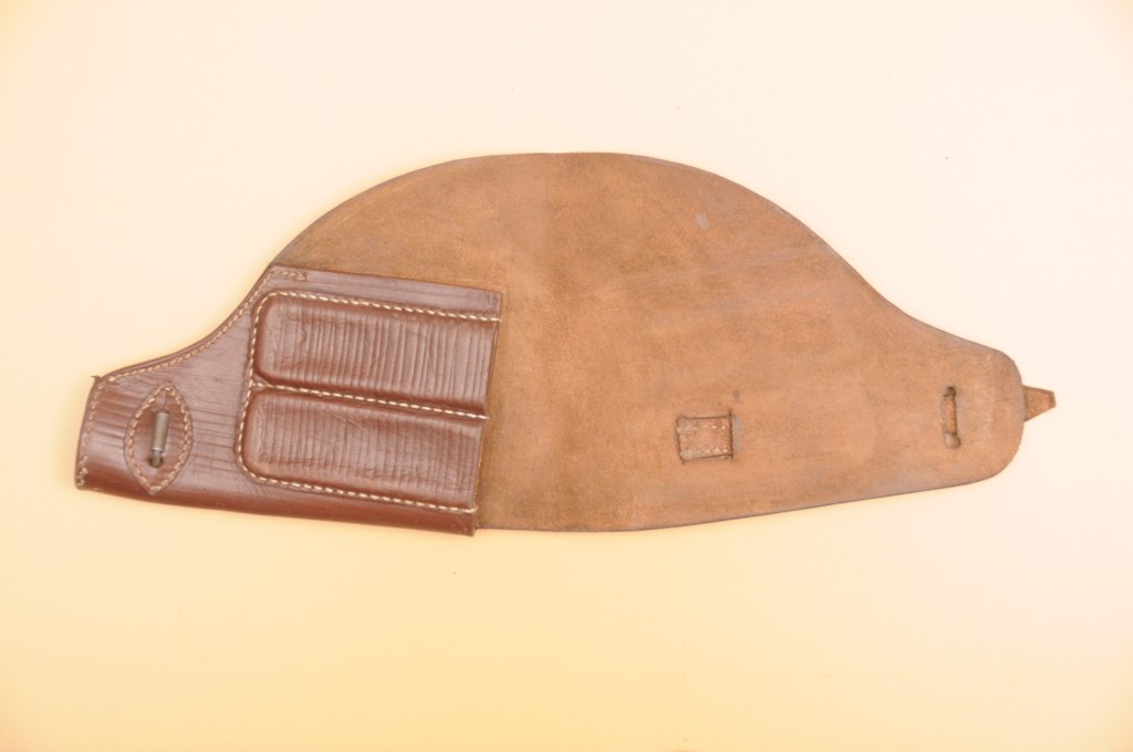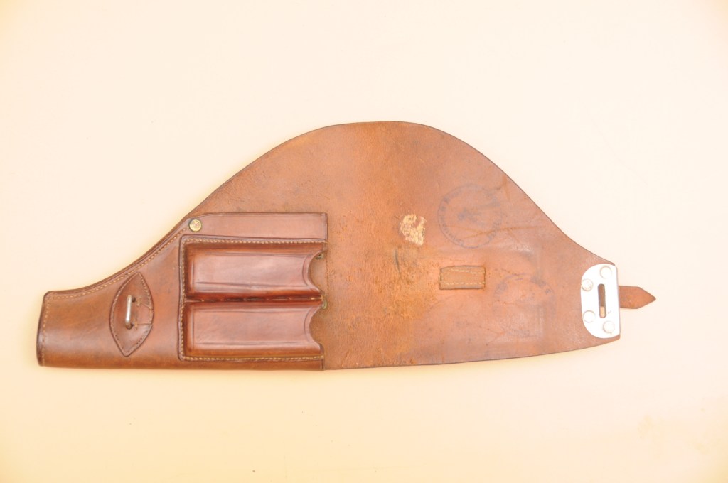 Bruin glad leer, 155mm breed en 380mm hoog, dubbele 25mm brede riemlussen aan de achterkant, sluiting van boven naar beneden doorheen een vernikkelde beugel, vernikkeld beslag met 4 rivetten op het uiteinde van de flap, geen vak voor reservelader, met ruimte voor poetsstok, met ruimte voor houten kolf.