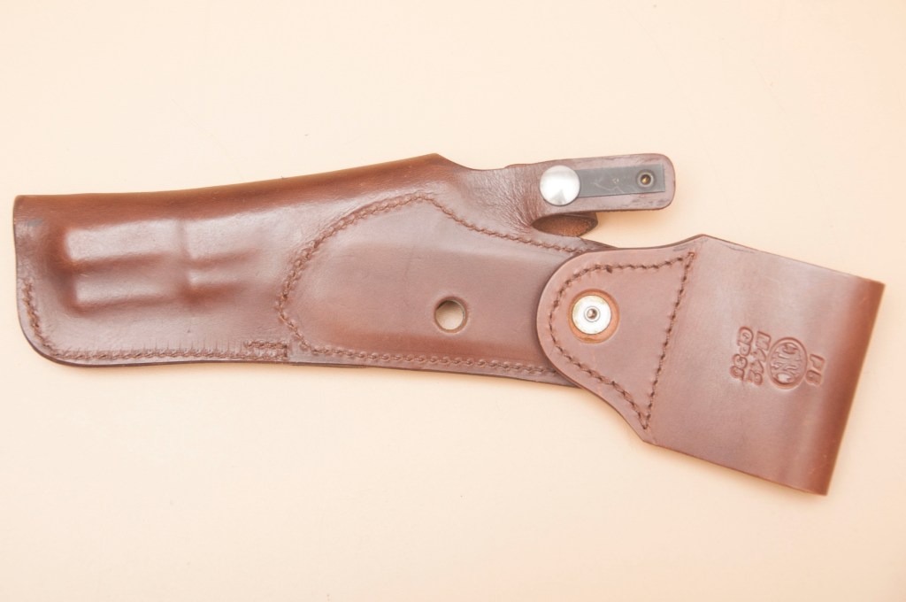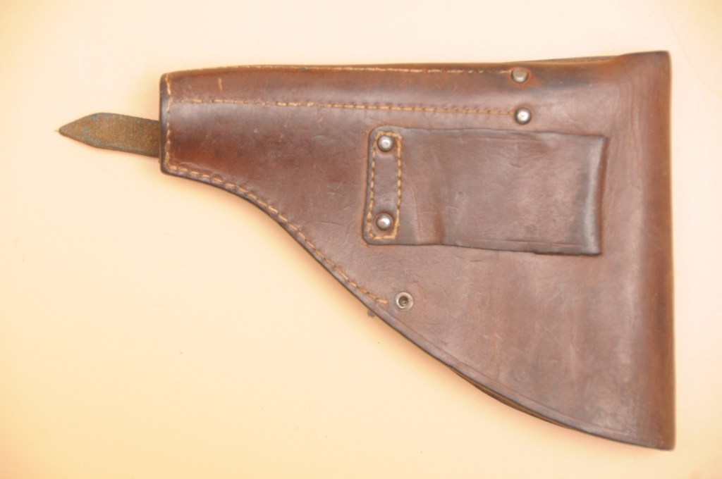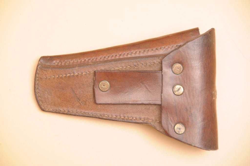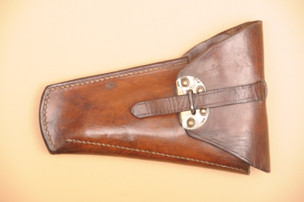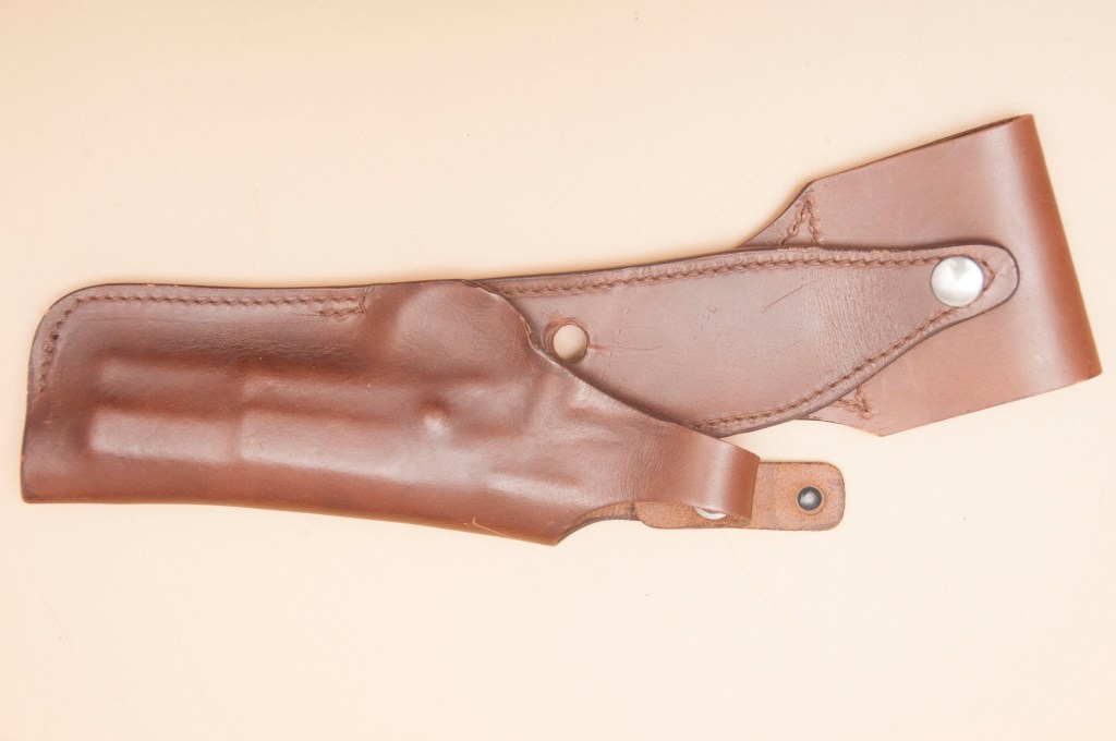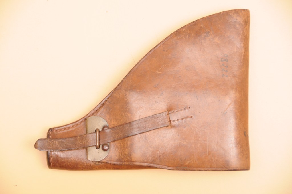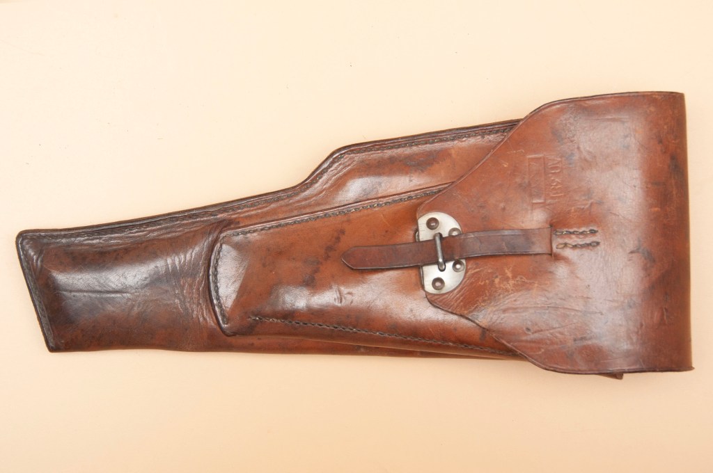 Bruin glad leer, 155mm breed en 380mm hoog, dubbele 25mm brede riemlussen aan de achterkant, sluiting van boven naar beneden doorheen een vernikkelde beugel, vernikkeld beslag met 4 rivetten op het uiteinde van de flap, geen vak voor reservelader, met ruimte voor poetsstok, met ruimte voor houten kolf.