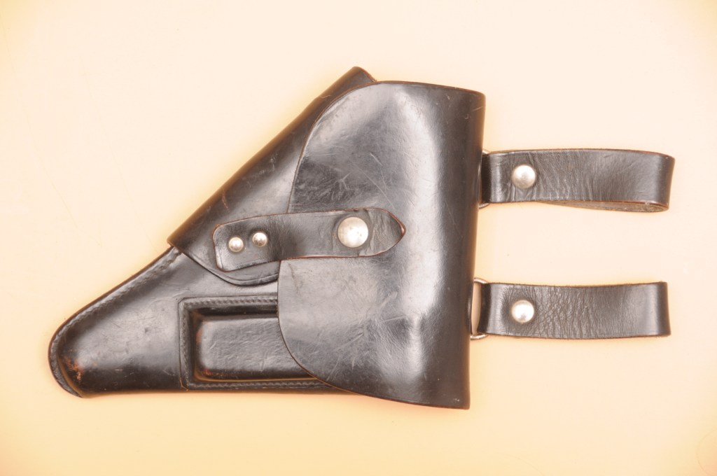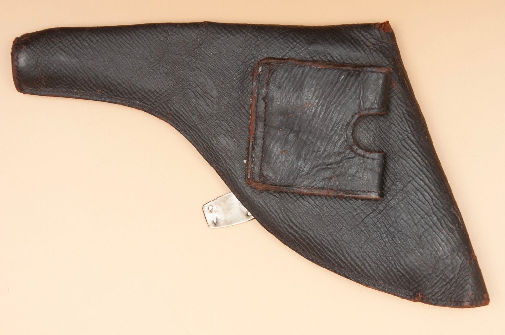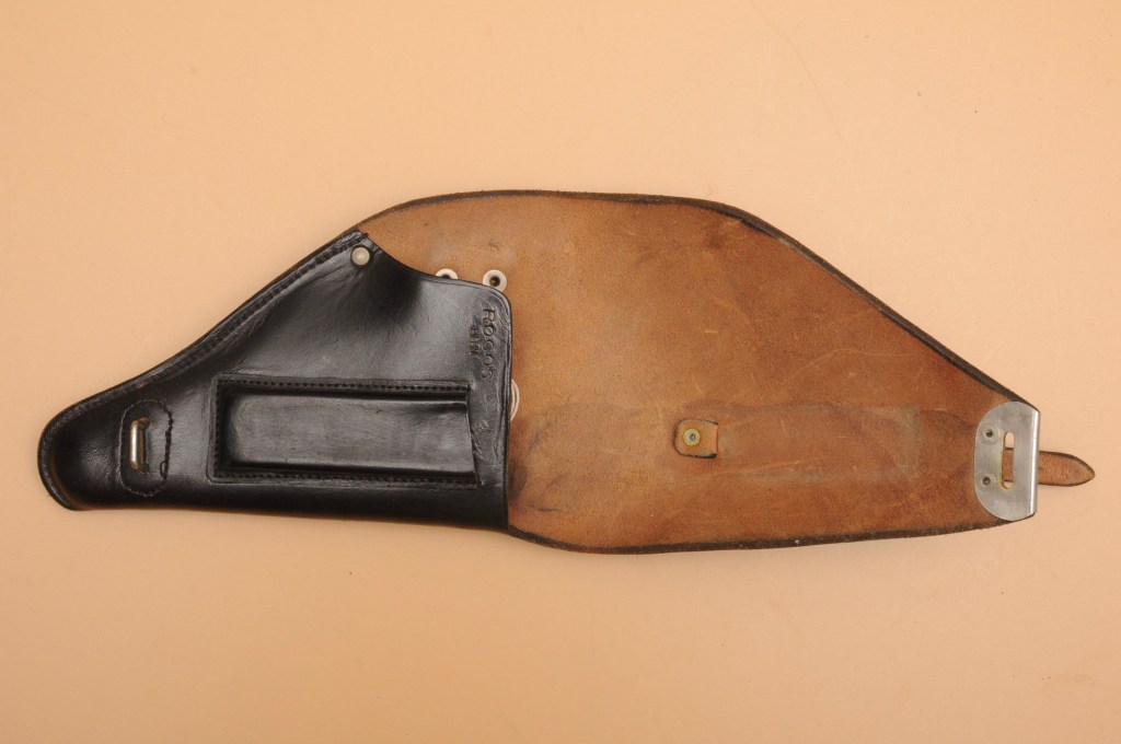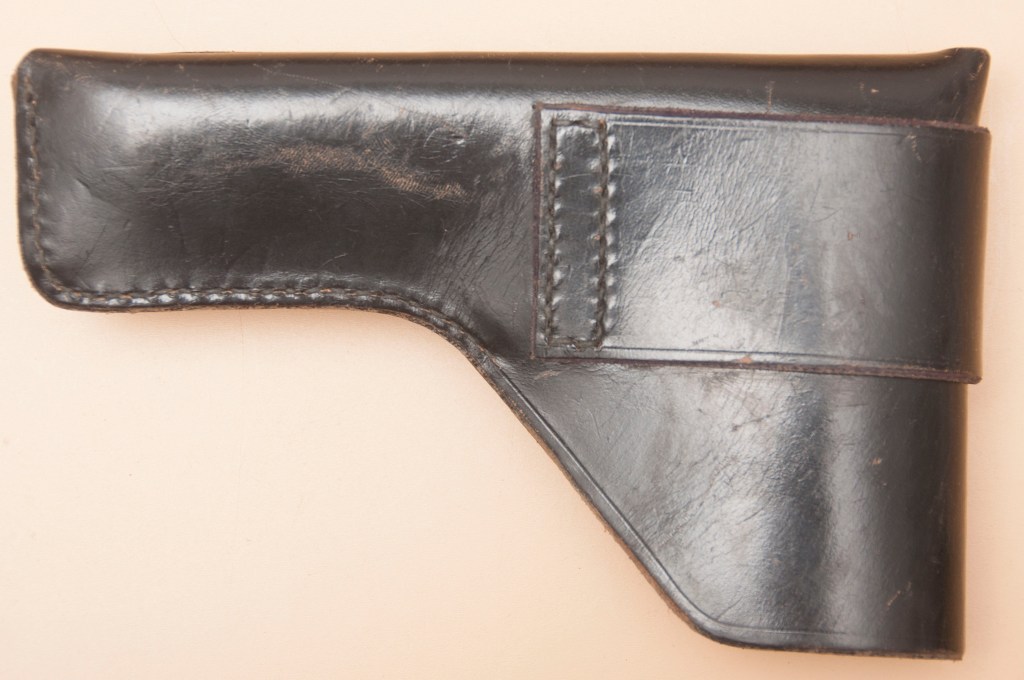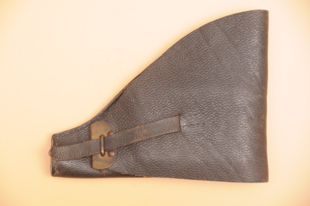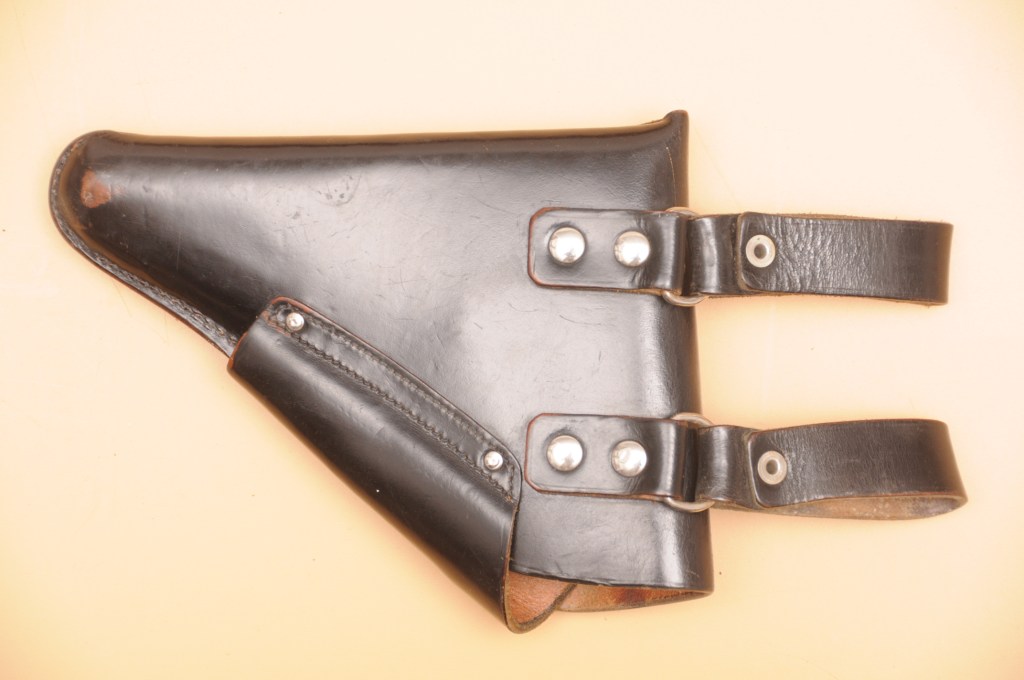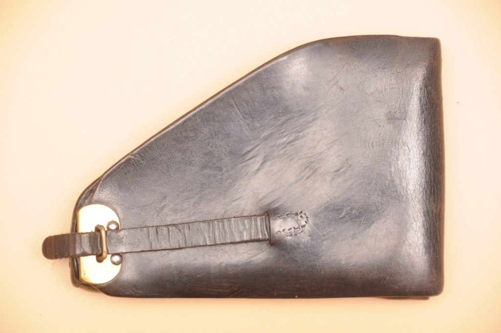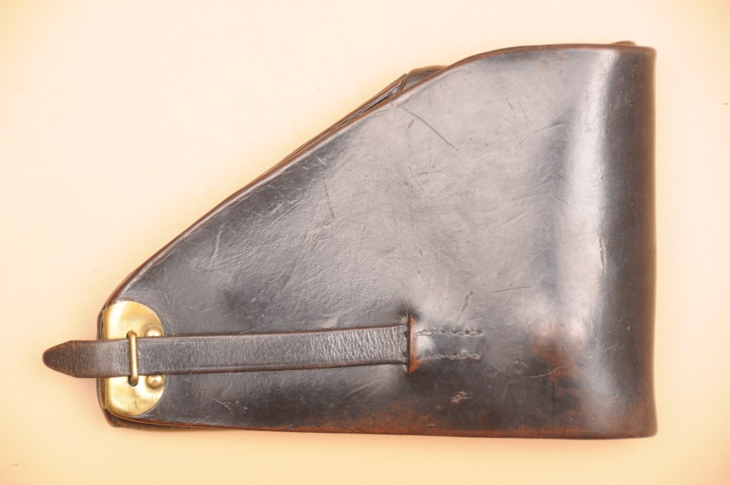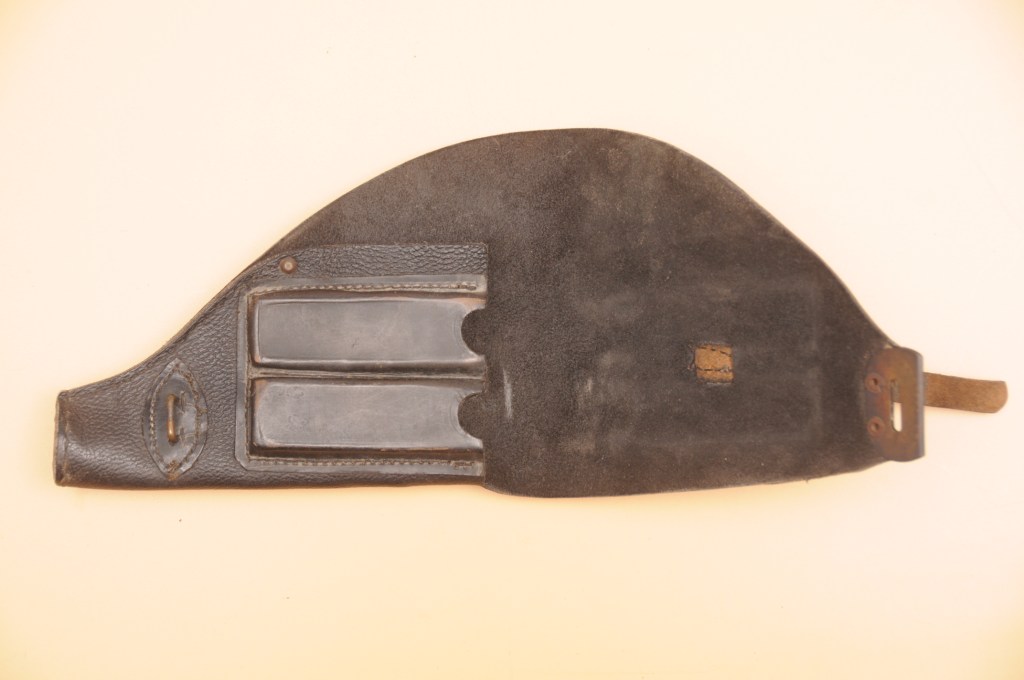 Zwart glad leer, 125mm breed en 180mm hoog, enkele 44mm brede riemlus aan de achterkant, sluiting van boven naar beneden door een messing beugel, sporen van 2 verwijderde vakken voor reservelader aan de voorkant, met ruimte voor poetsstok.