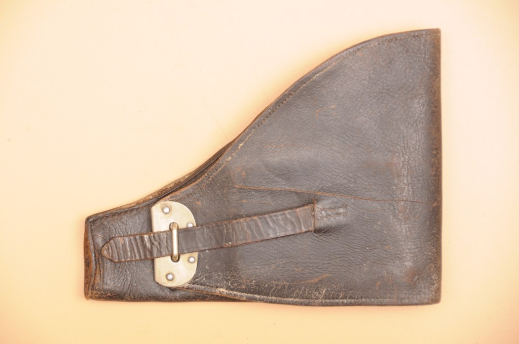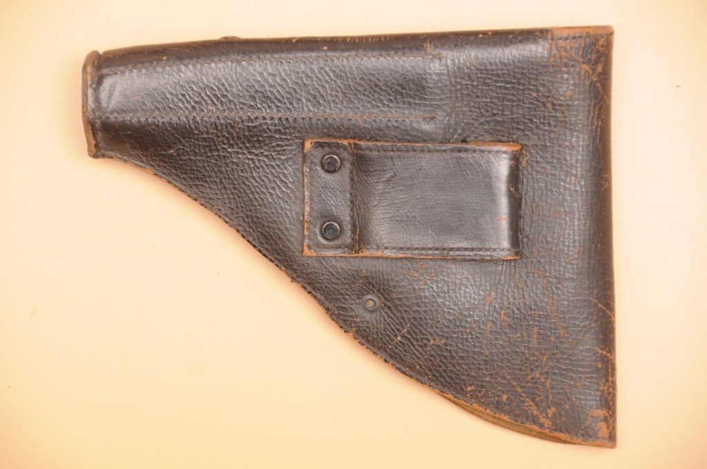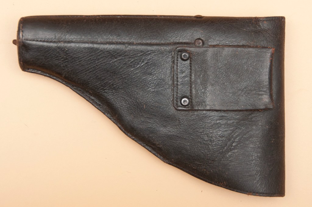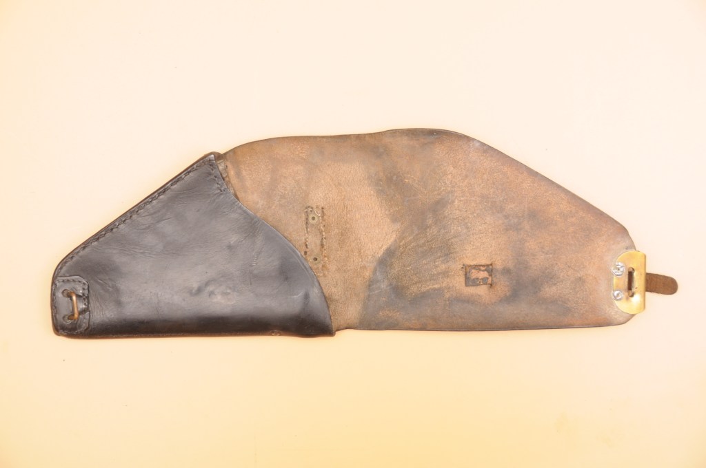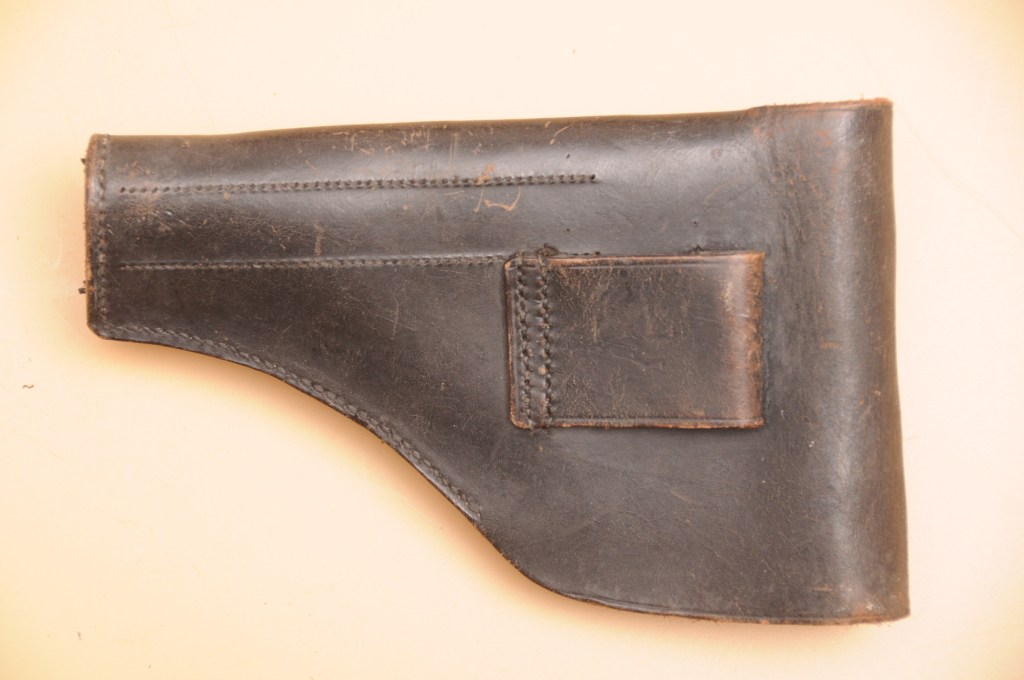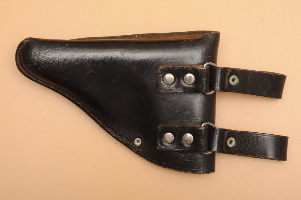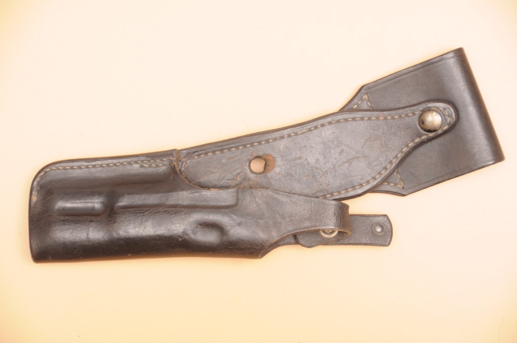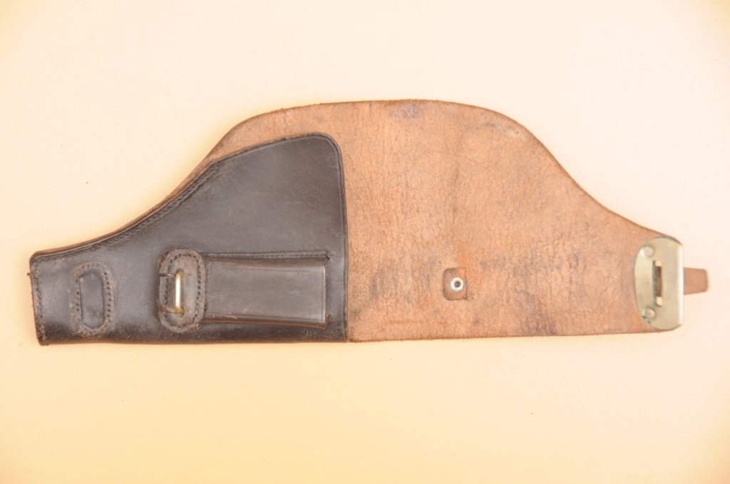 Zwart glad leer, 125mm breed en 180mm hoog, enkele 44mm brede riemlus aan de achterkant, sluiting van boven naar beneden door een messing beugel, sporen van 2 verwijderde vakken voor reservelader aan de voorkant, met ruimte voor poetsstok.