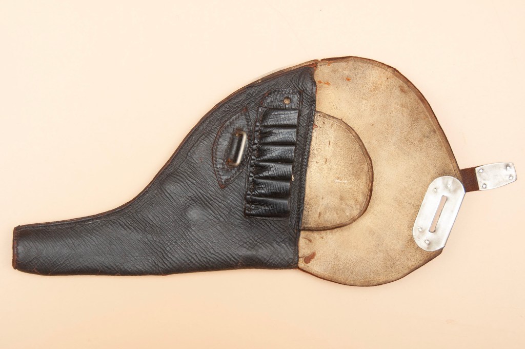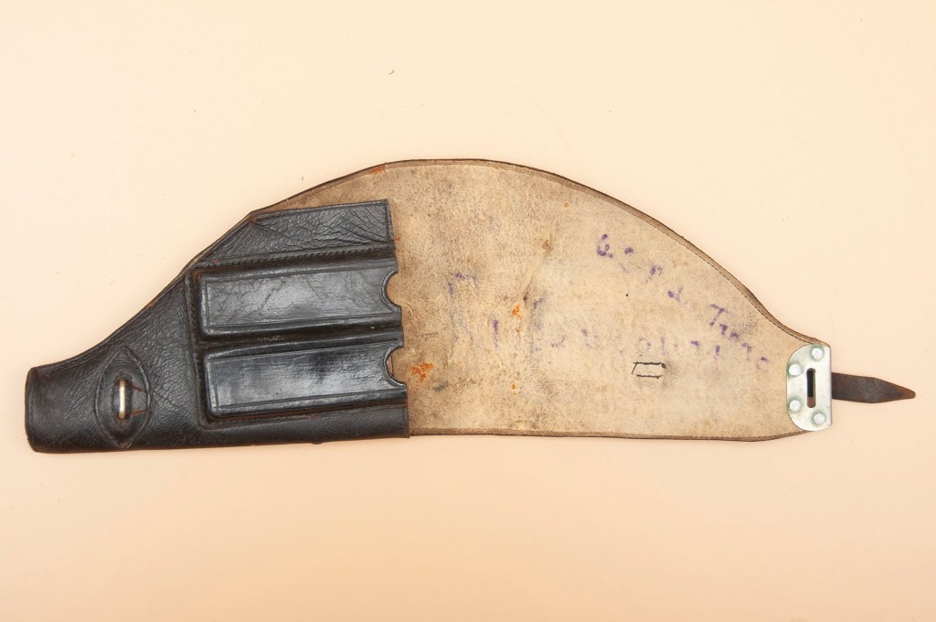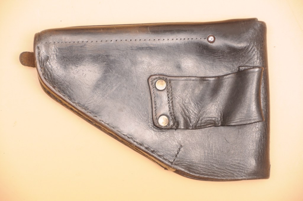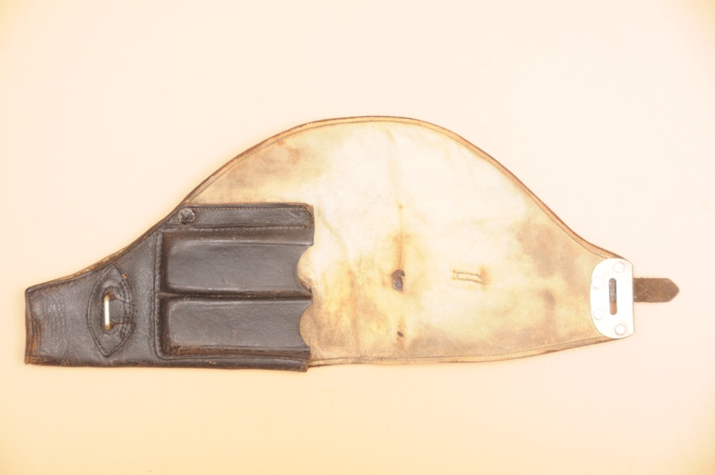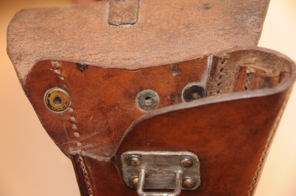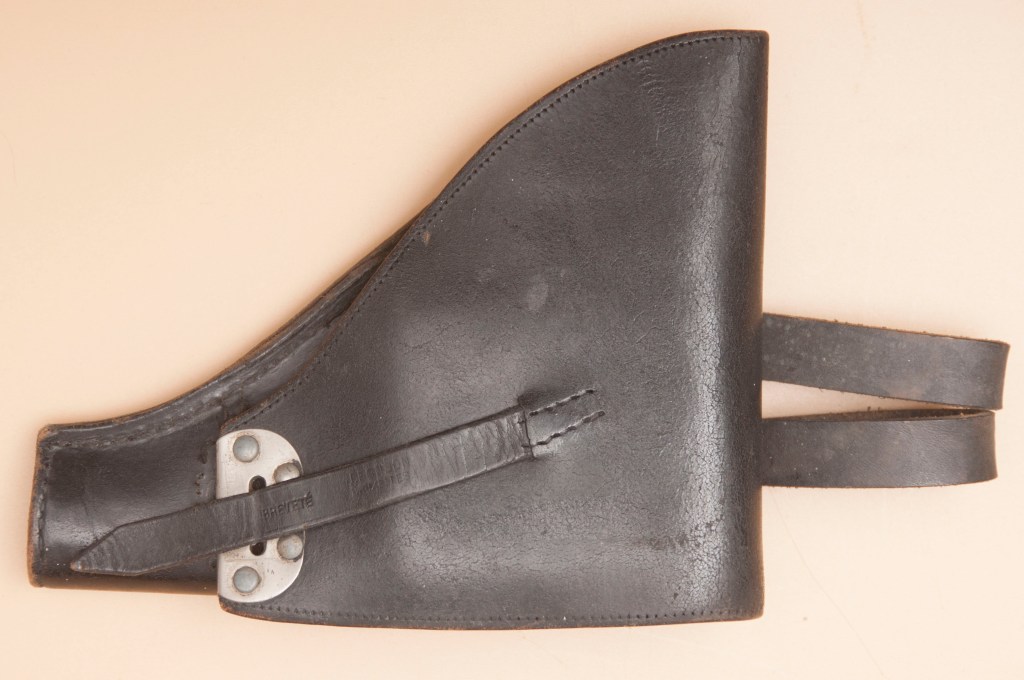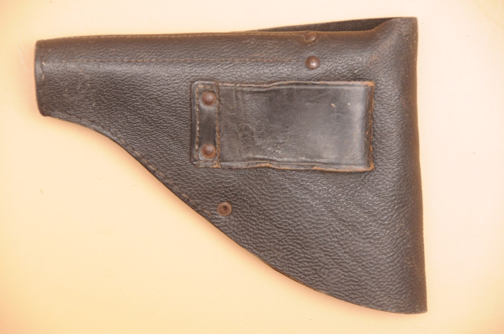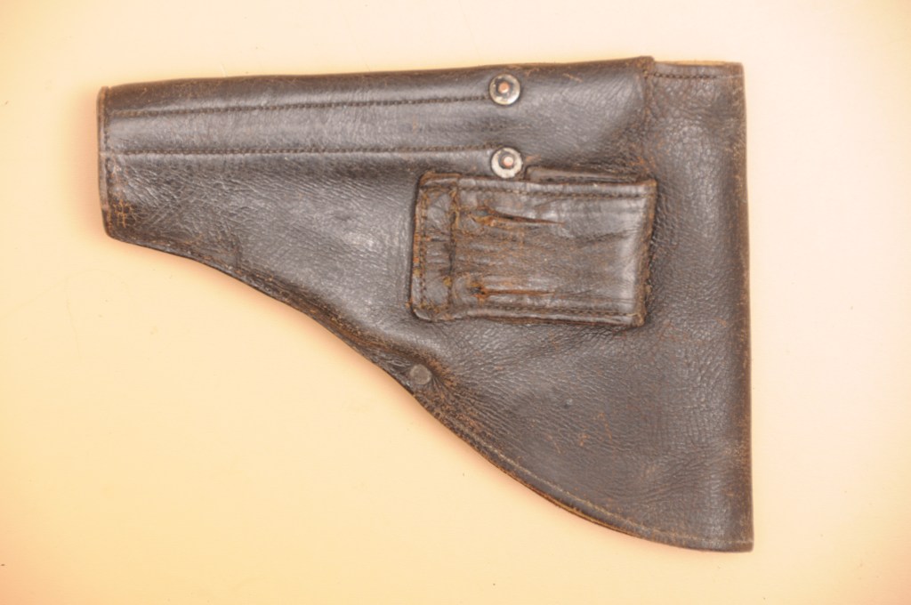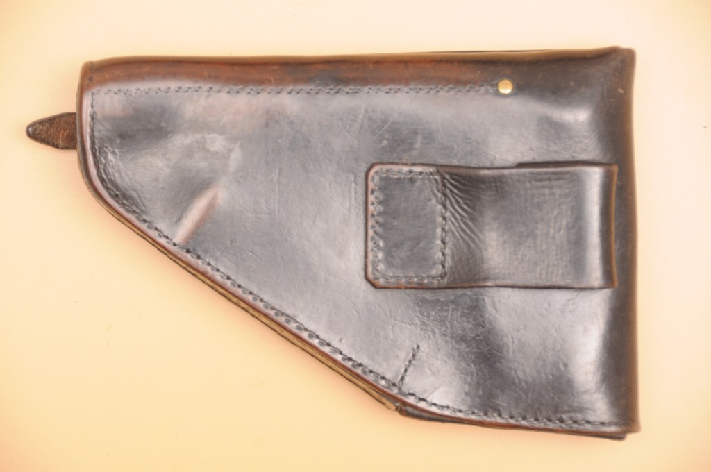 Zwart glad leer, 125mm breed en 180mm hoog, enkele 44mm brede riemlus aan de achterkant, sluiting van boven naar beneden door een messing beugel, sporen van 2 verwijderde vakken voor reservelader aan de voorkant, met ruimte voor poetsstok.