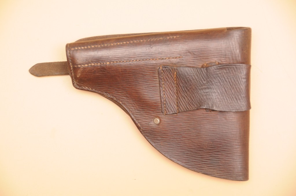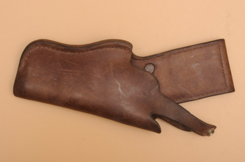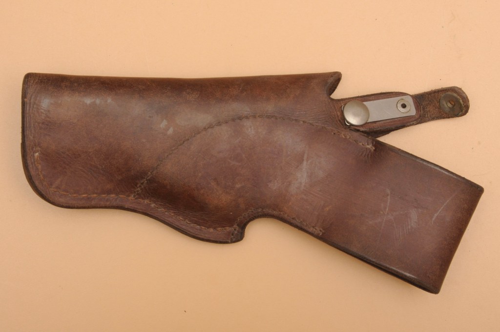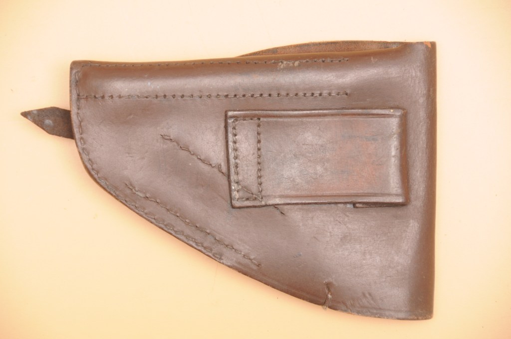 Bruin glad leer, 100mm breed en 300mm hoog, enkele 78mm brede riemlus met drukknop en draaias aan de achterkant, sluiting met drukknop en snelopening overlangs. Silhouet van pistool in het leer gedrukt.
