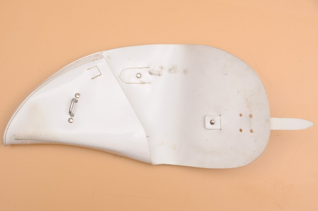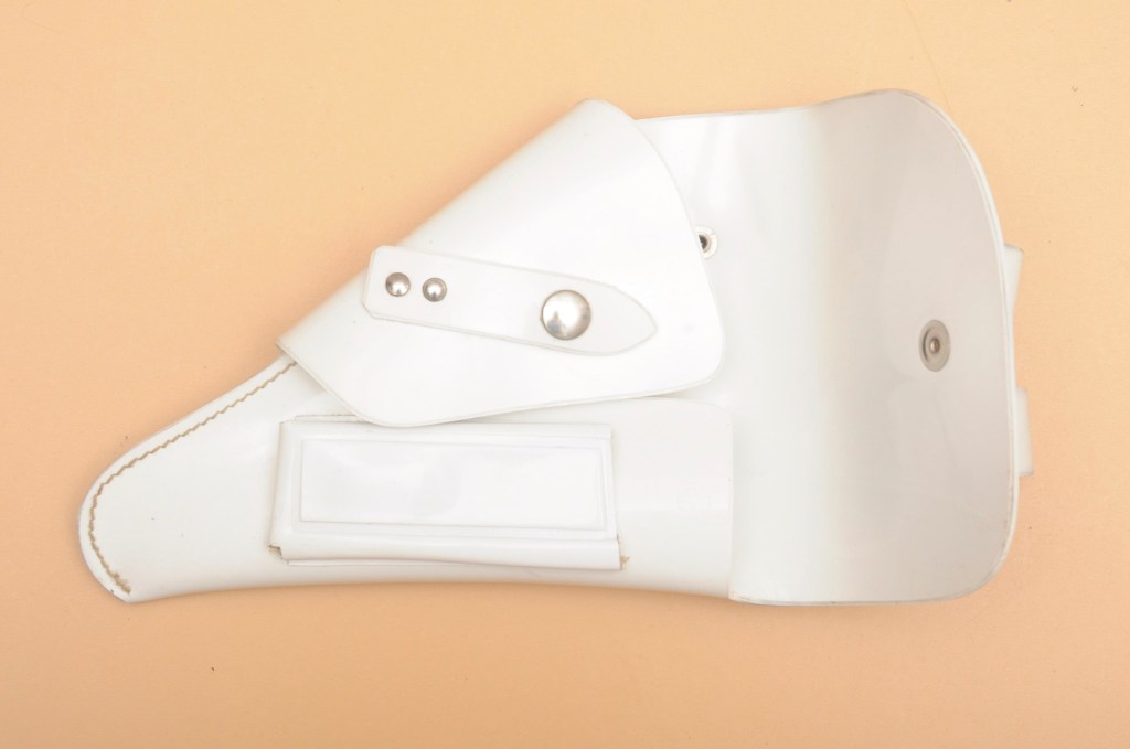 Wit kunststof met binnenin lederlook textuur, hard boxmodel, 175mm breed en 215mm hoog, dubbele 25mm brede riemlussen aan de achterkant, sluiting van boven naar beneden doorheen een stalen beugel die door twee verschillende opening in de flap past, 1 vak voor reservelader aan de binnenkant, met ruimte voor poetsstok.