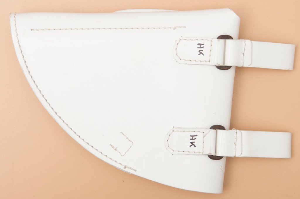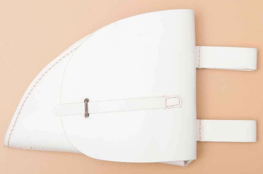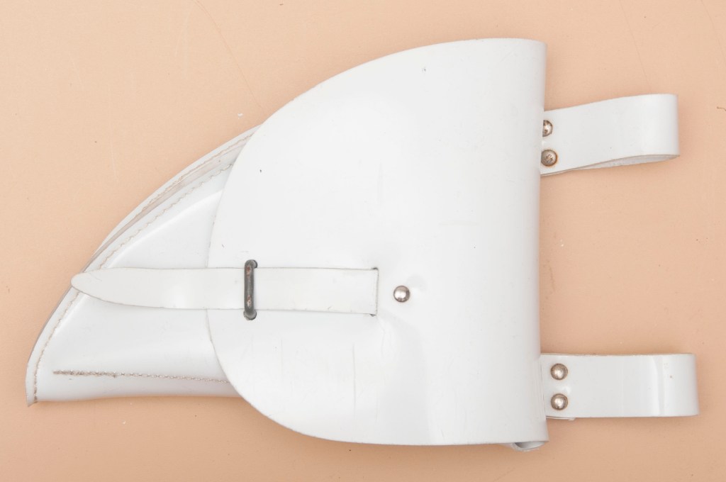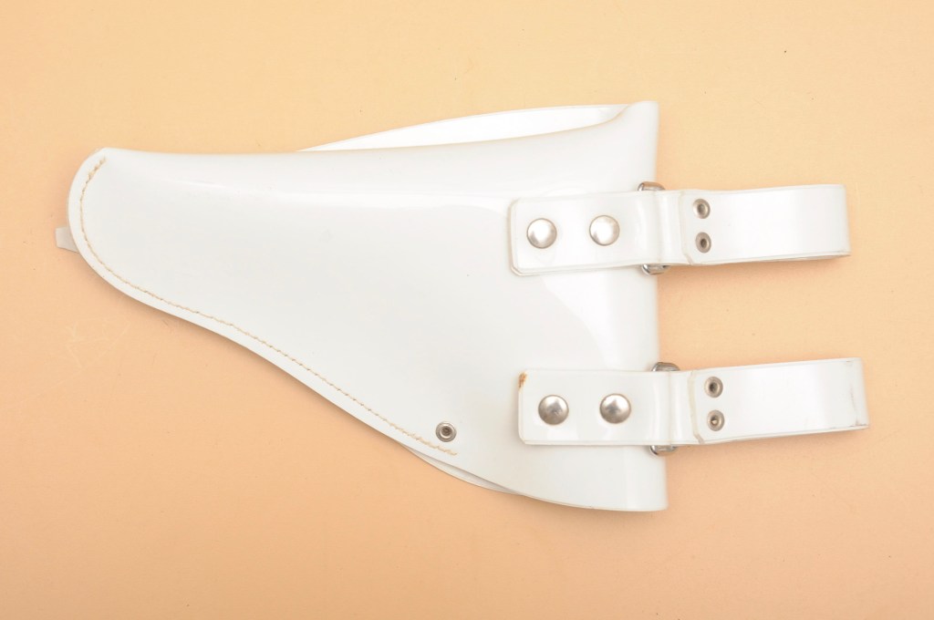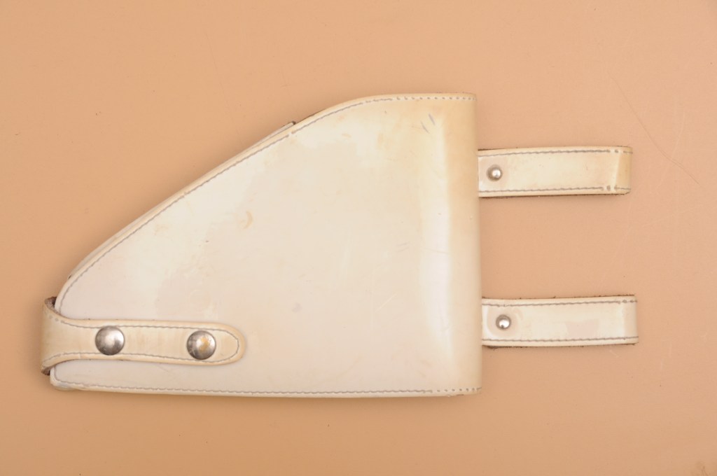 Wit gelakt leer, hard boxmodel, 155mm breed en 220mm hoog, dubbele 25mm brede riemlussen aan de achterkant, sluiting van beneden naar boven met 2 vernikkelde drukknoppen, 1 vak voor reservelader aan de binnenkant, met ruimte voor poetsstok.