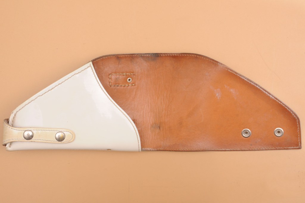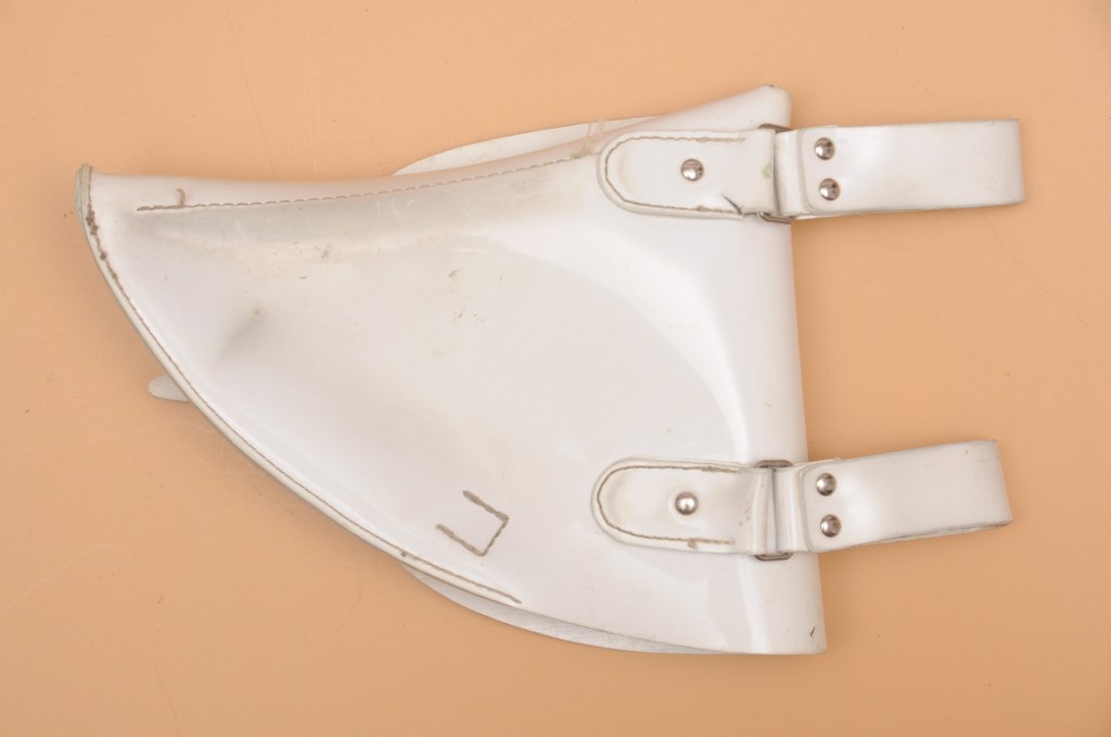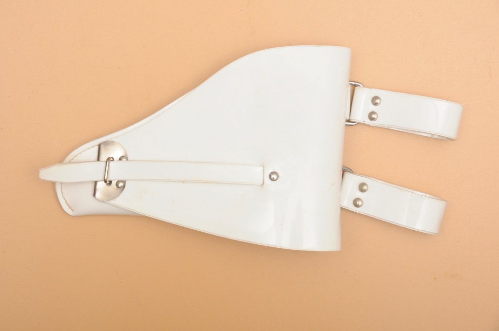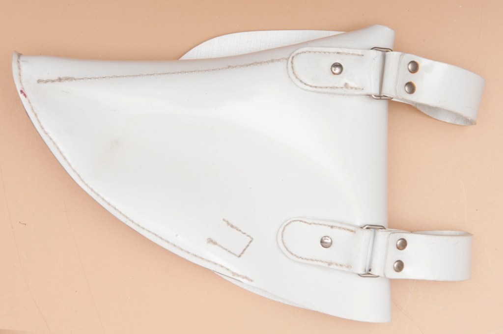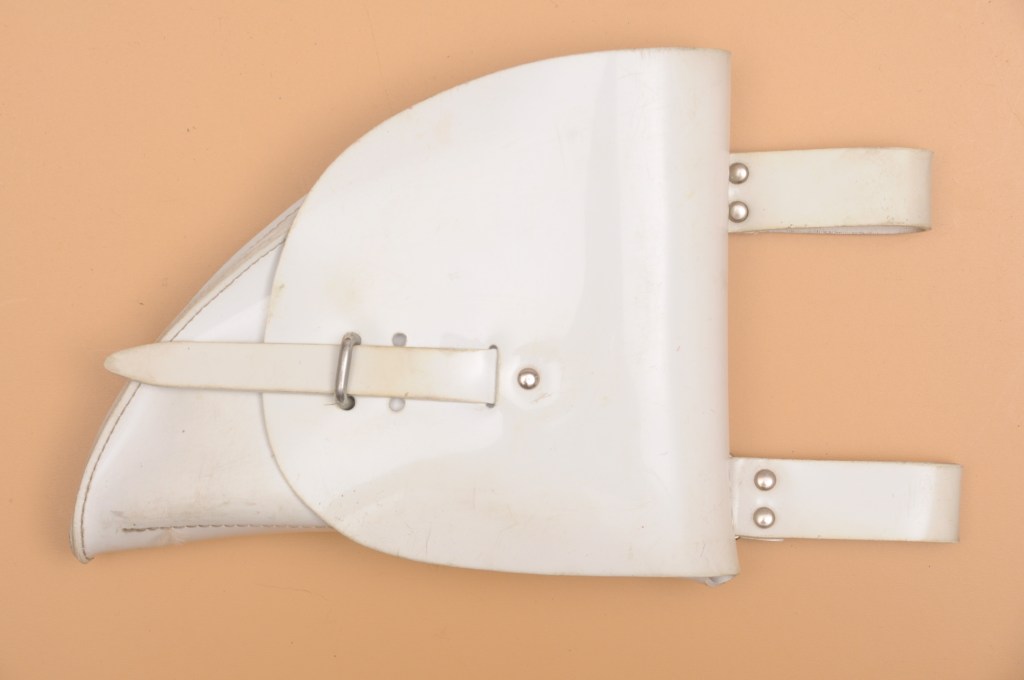 Wit gelakt leer, hard boxmodel, 155mm breed en 220mm hoog, dubbele 25mm brede riemlussen aan de achterkant, sluiting van beneden naar boven met 2 vernikkelde drukknoppen, 1 vak voor reservelader aan de binnenkant, met ruimte voor poetsstok.