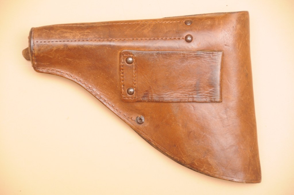 Lichtbruin glad leer, 130mm breed en 260mm hoog, enkele 47mm brede riemlus aan de achterkant, sluiting van boven naar beneden met messing knop, geen vakken voor reservelader, geen ruimte voor poetsstok.