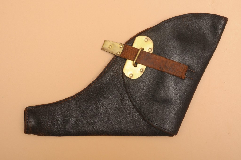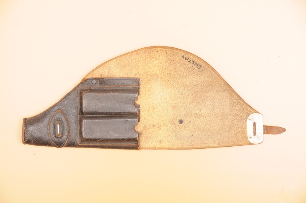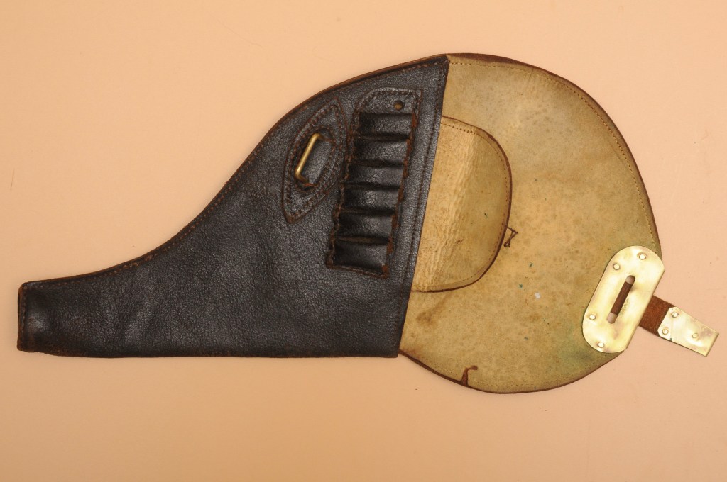 Zwart geribbeld leer met binnenin beige suède voering, 190mm breed en 300mm hoog, enkele 85mm brede riemlus aan de achterkant, sluiting van boven naar beneden doorheen een messing beugel, messing beslag met 4 rivetten op het uiteinde van de flap, 6 vakken voor losse patronen aan de voorkant bedenkt met leren flap, geen ruimte voor poetsstok.