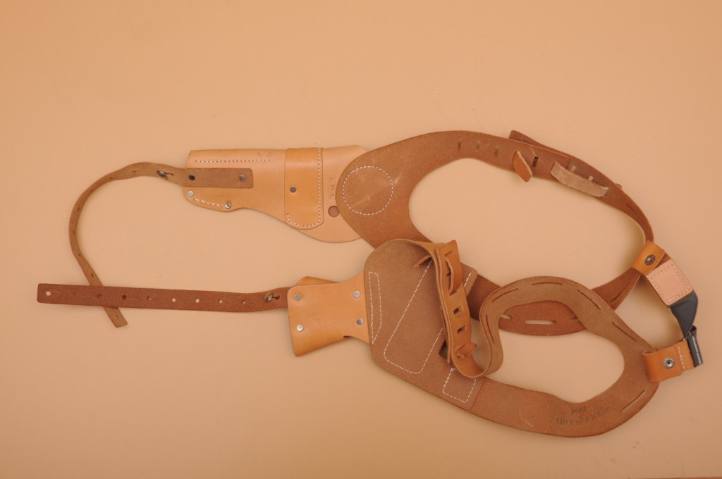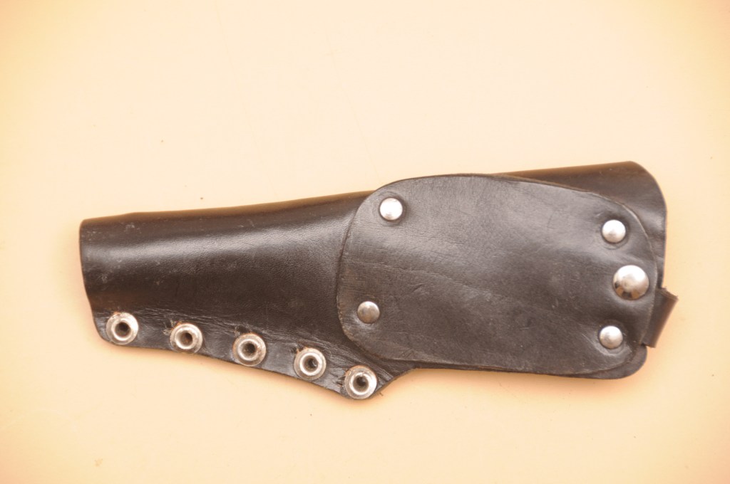 Bruin glad leer, 90mm breed en 250mm hoog, enkele 60mm brede riemlus. Sluiting met drukknop en snelopening overlangs. Gebruikt door het Département Nature & Fôrets (DNF, boswachters in Wallonië).