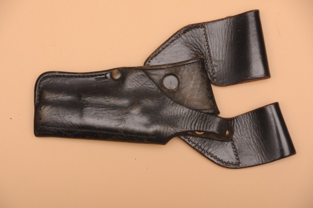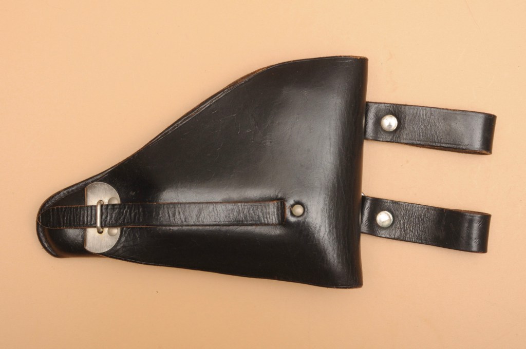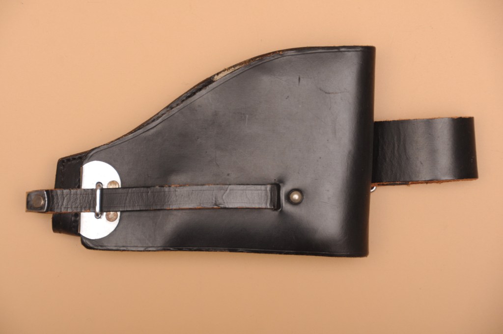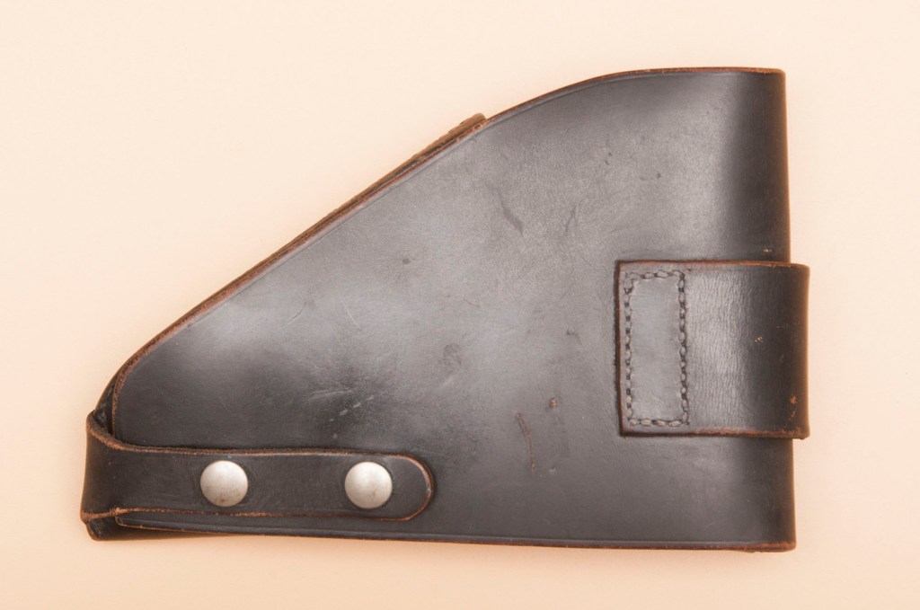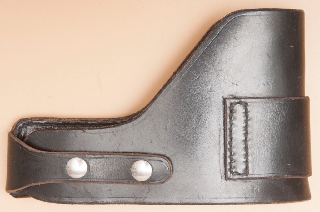 Zwart glad leer, 100mm breed en 300mm hoog, enkele 78mm brede riemlus met drukknop en draaias aan de achterkant, sluiting met drukknop en snelopening overlangs. Silhouet van pistool in het leer gedrukt.