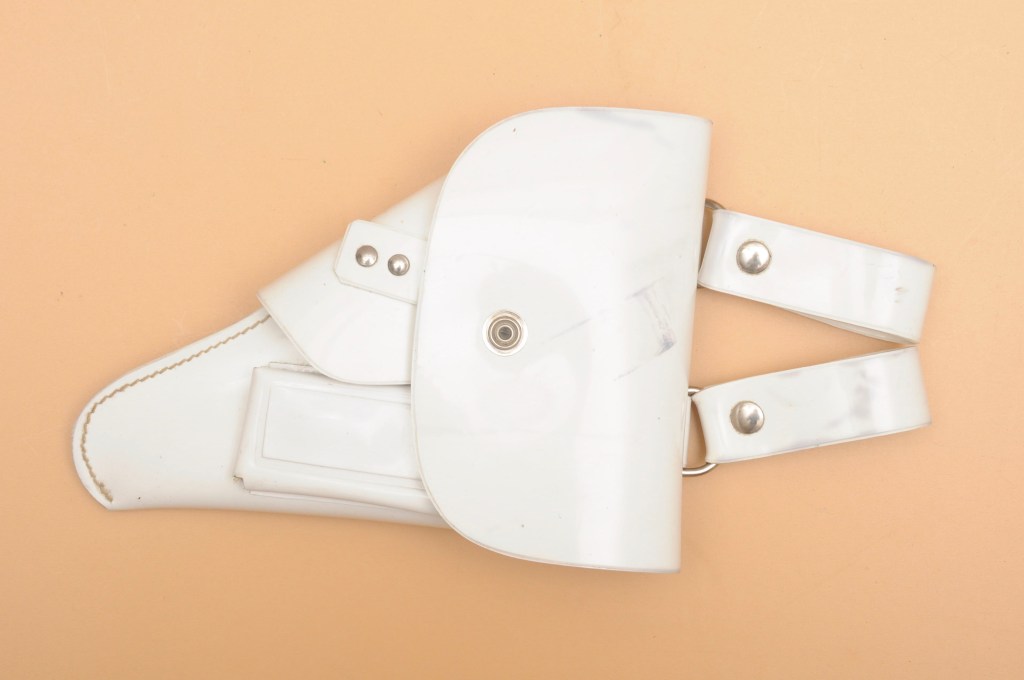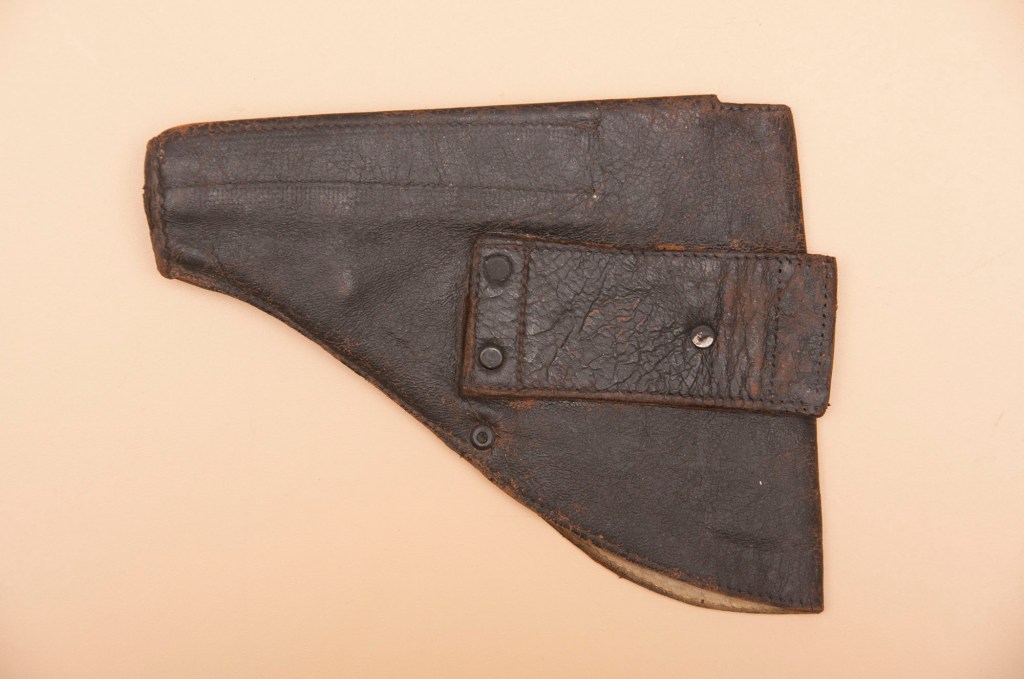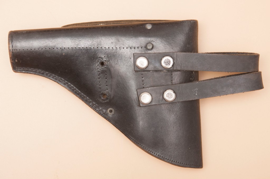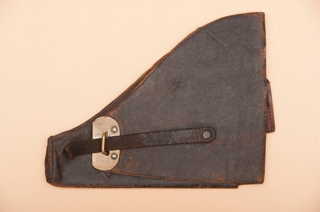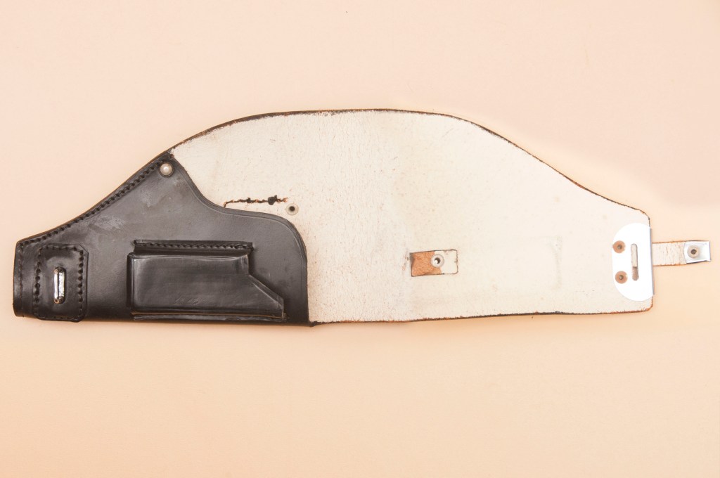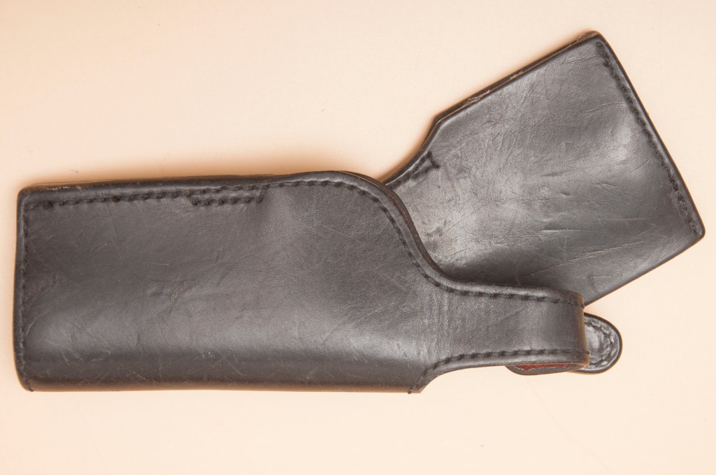 Zwart glad leer, 100mm breed en 300mm hoog, enkele 78mm brede riemlus met drukknop en draaias aan de achterkant, sluiting met drukknop en snelopening overlangs. Silhouet van pistool in het leer gedrukt.