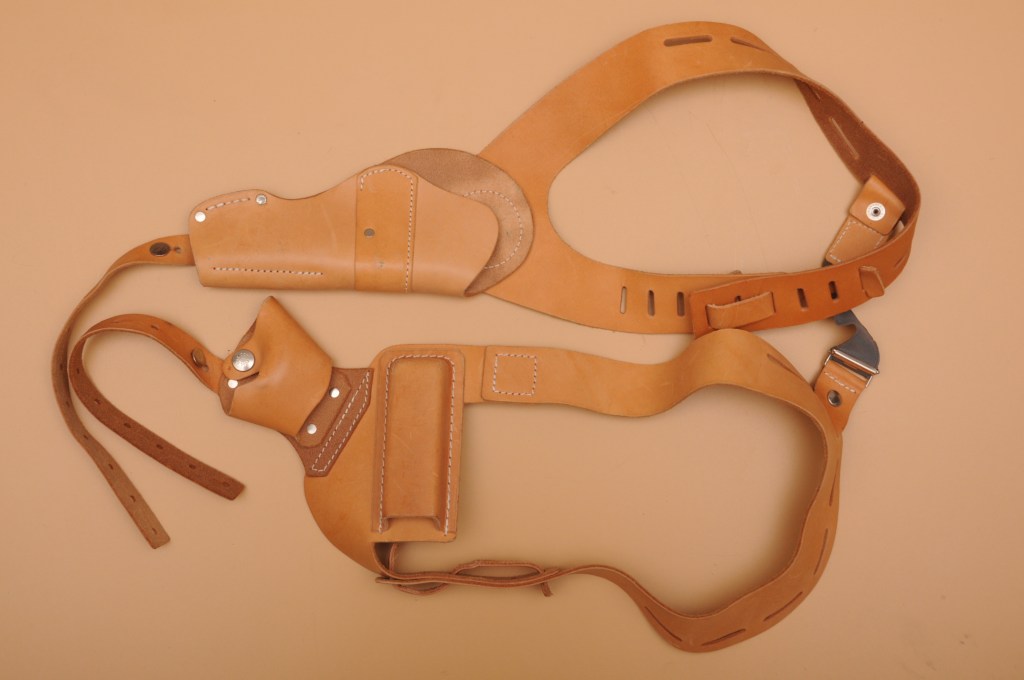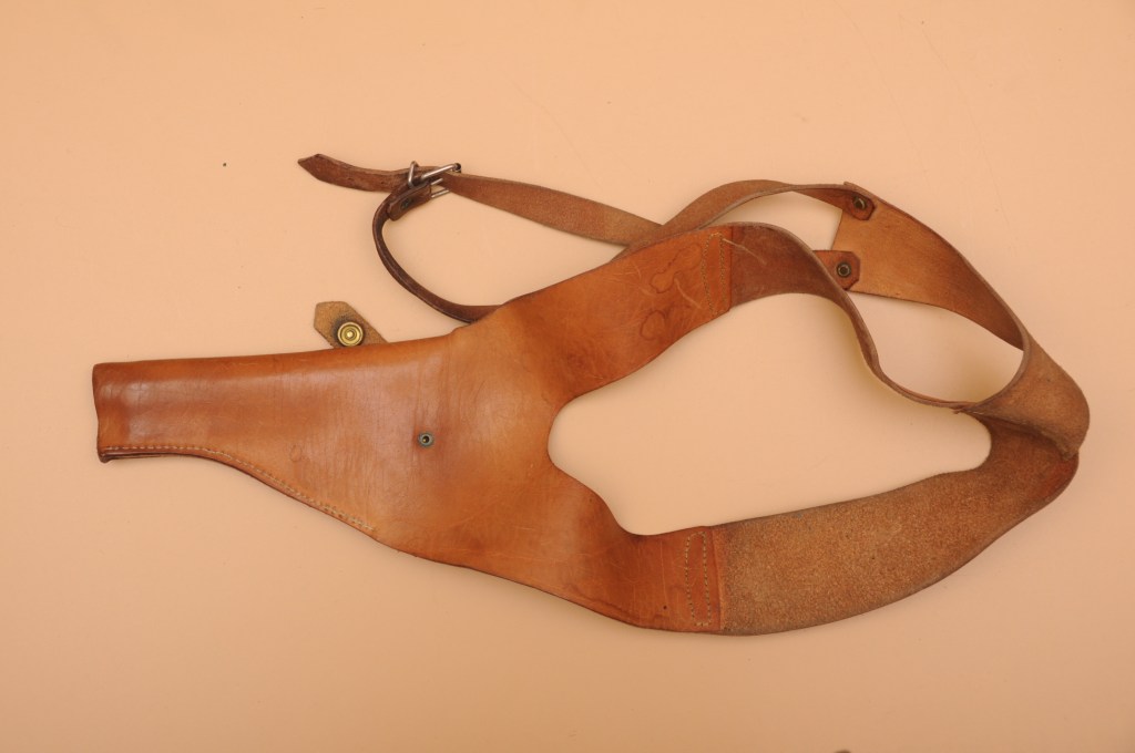 Bruin glad leer, 105mm breed en 225mm hoog, aan beide zijden een 40mm brede riem die rond de schouders gedragen wordt, geen sluiting voor het afsluiten van de holster. 1 vak voor reservelader, geen voorziening voor poetsstok.