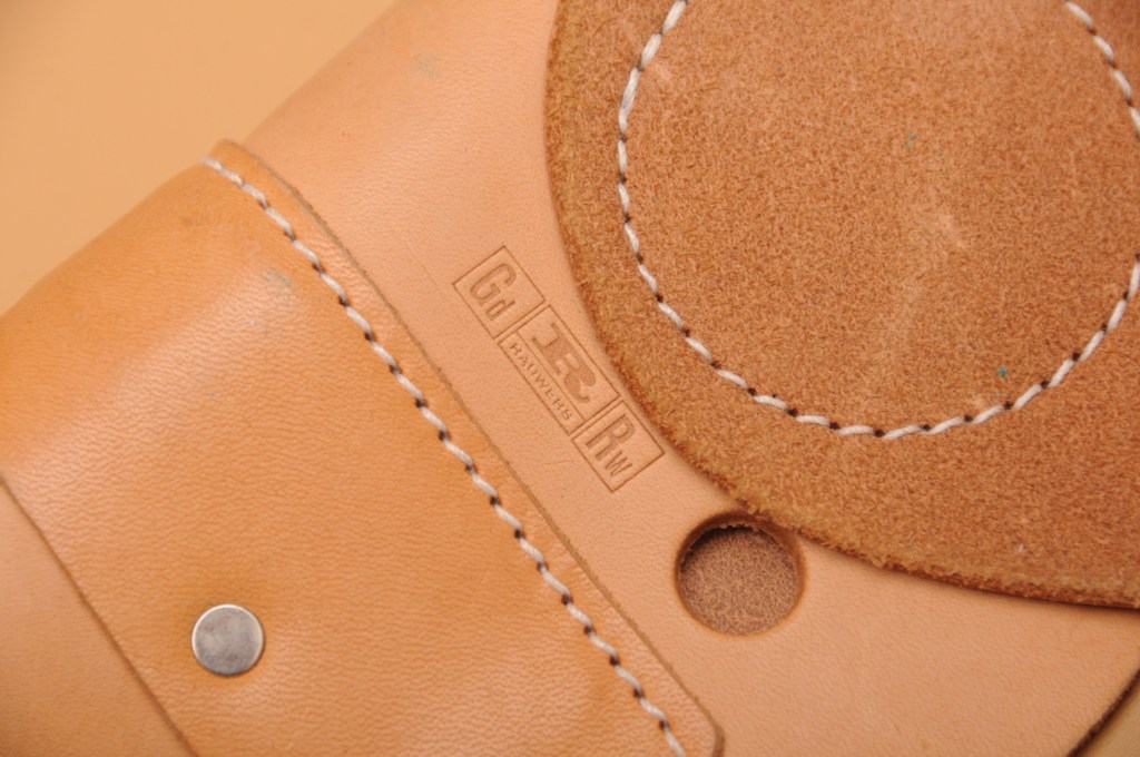 Lichtbruin glad leer, 155mm breed en 195mm hoog, enkele 45mm brede riemlus aan de achterkant, sluiting van boven naar beneden doorheen een vernikkelde beugel, messing beslag met 4 rivetten op het uiteinde van de flap, 2 vakken voor reservelader aan de voorkant, met ruimte voor poetsstok.