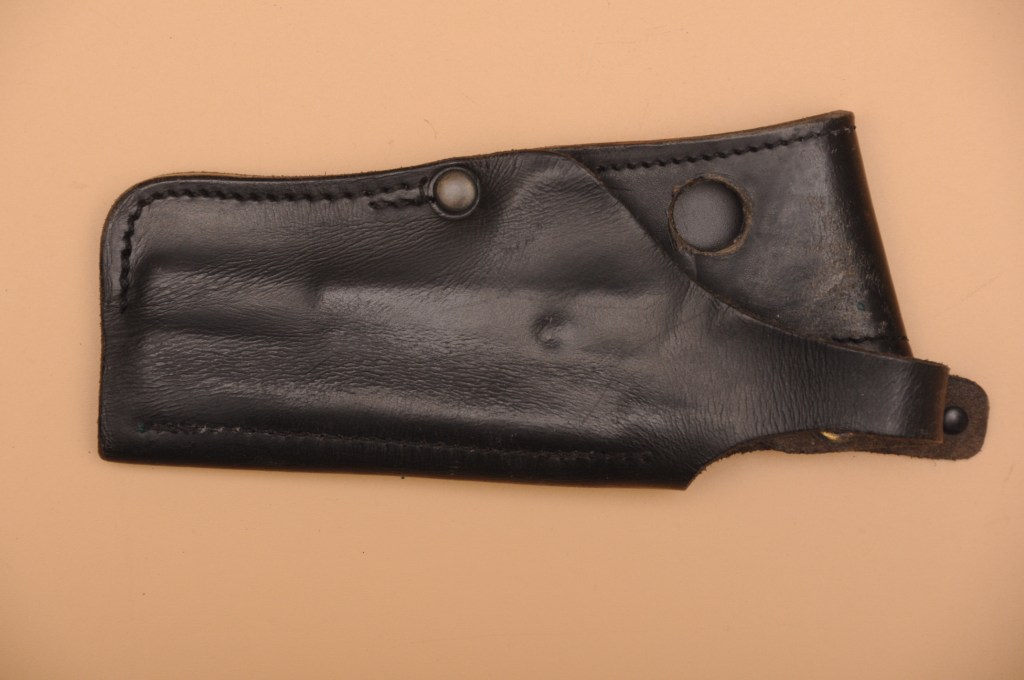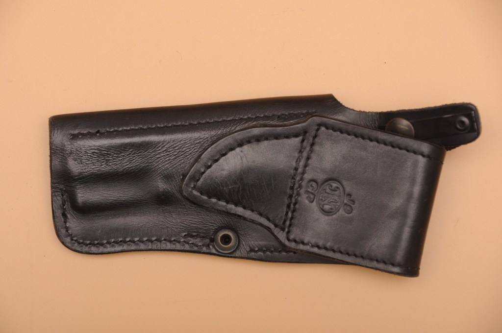 Zwart glad leer, 125mm breed en 190mm hoog, enkele 35mm brede riemlus aan de achterkant, sluiting van boven naar beneden doorheen een vernikkelde beugel, vernikkeld beslag met 2 rivetten op het uiteinde van de flap, 1 vak voor reservelader aan de voorkant, geen ruimte voor poetsstok.