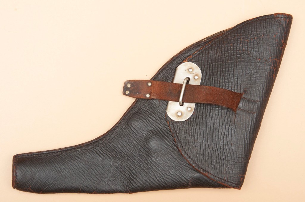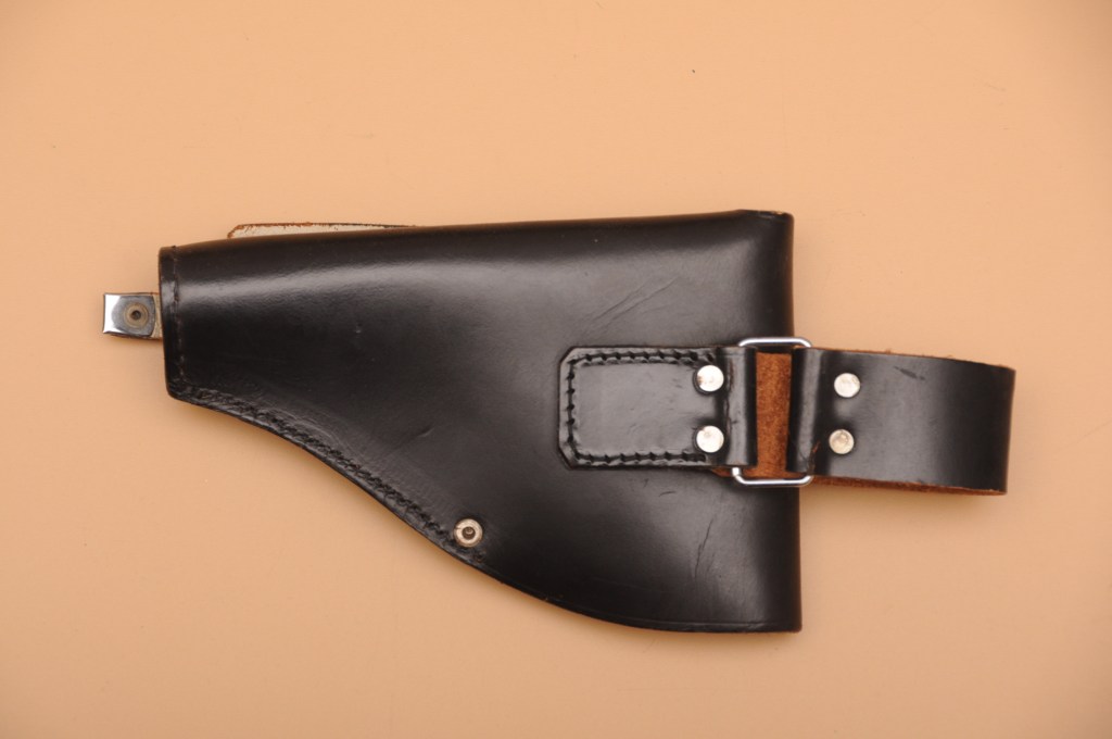 Zwart glad leer, 80mm breed en 200mm hoog, enkele 75mm brede riemlus. Messing rivet aan de achterkant, sluiting met drukknop en snelopening overlangs. Silhouet van pistool in het leer gedrukt.