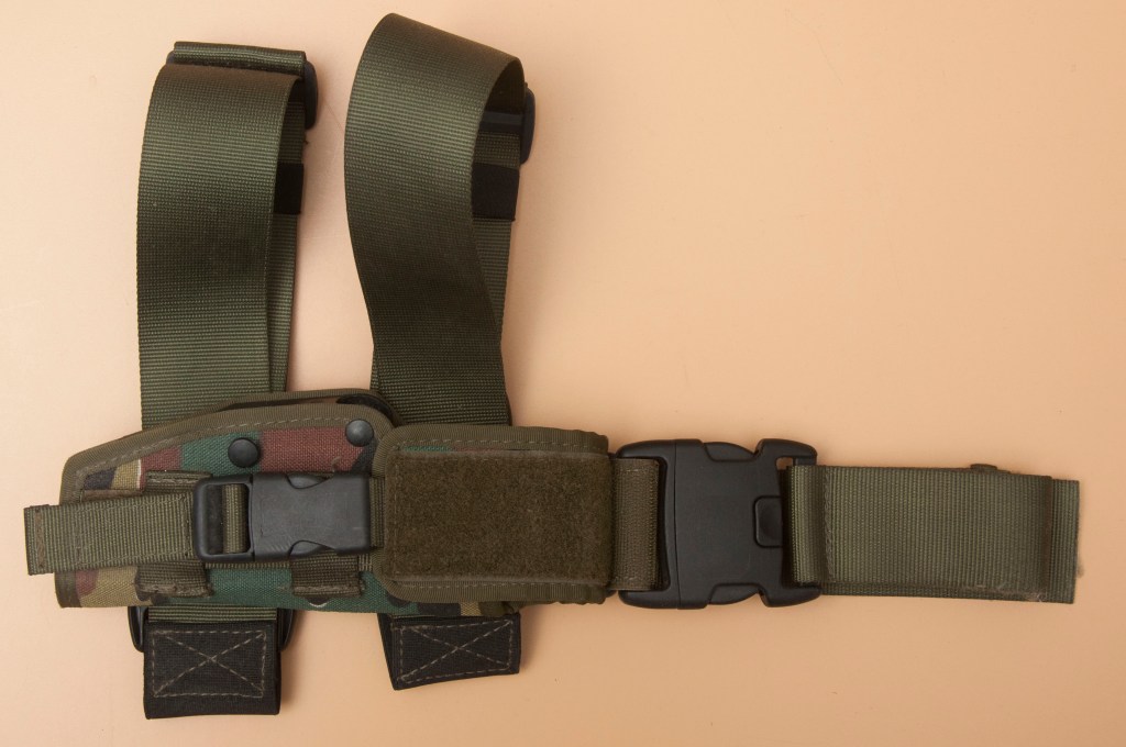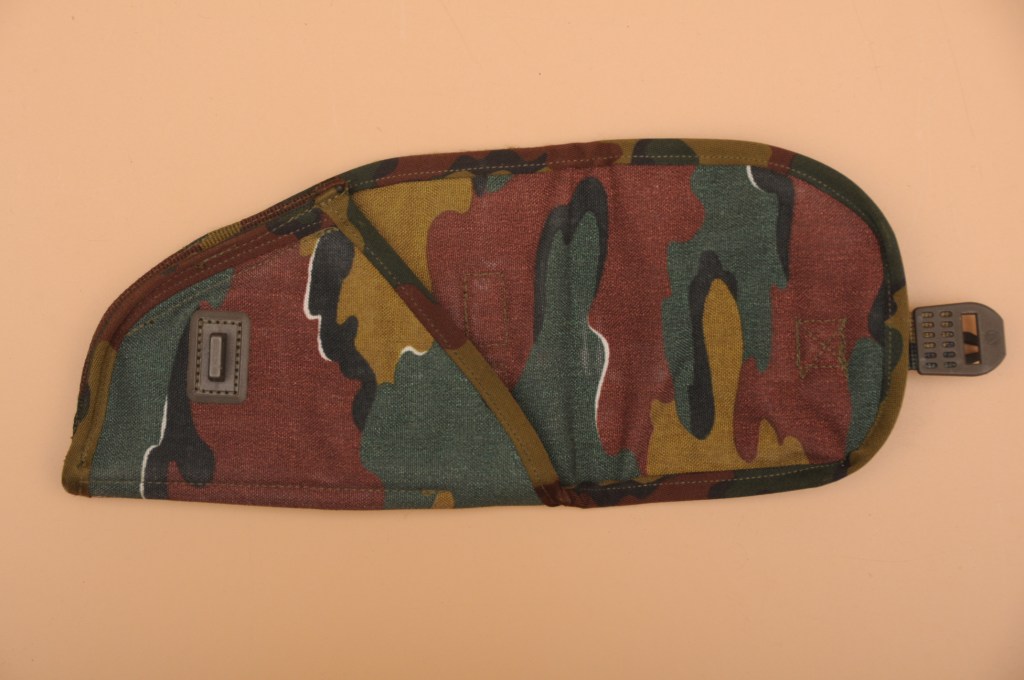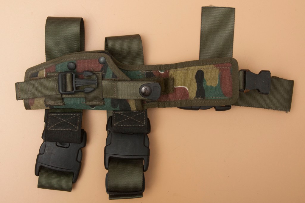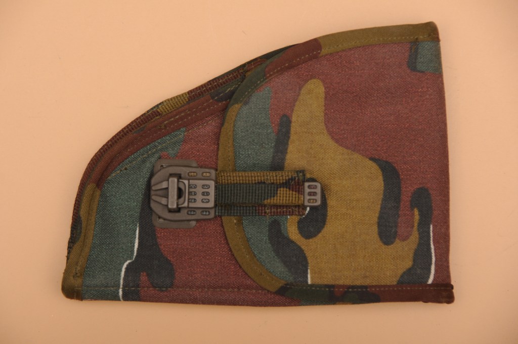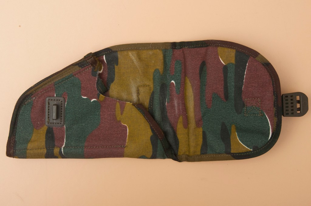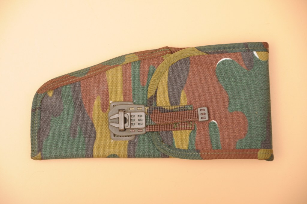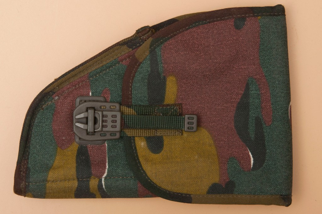 Variant met experimentele aanpassing voor het mogelijk maken van “push to cock” in de holster. Stof in Belgisch Jigsaw camouflagepatroon, 160mm breed en 220mm hoog, dubbele 12mm brede lussen aan de achterkant, sluiting van boven naar beneden doorheen een kunststof beugel, kunststof op het uiteinde van de flap en kunststof uiteinde van de sluitingsriem met kliksysteem, 1 vak voor reservelader aan de binnenkant, met ruimte voor poetsstok.
