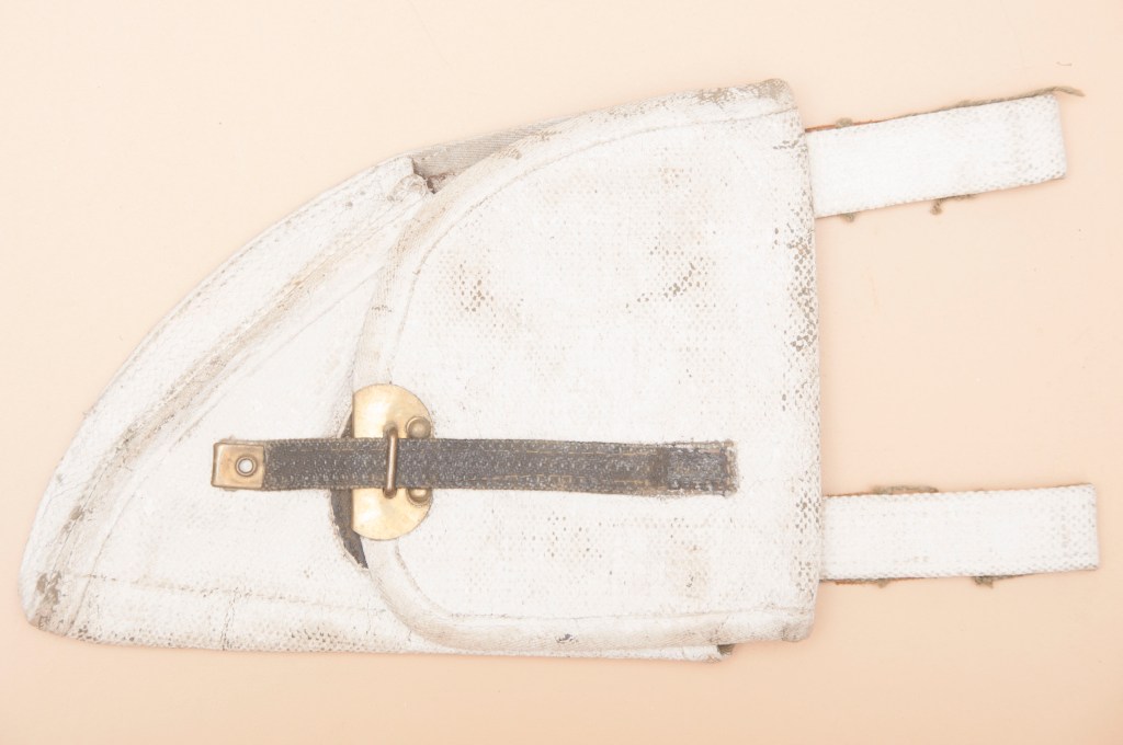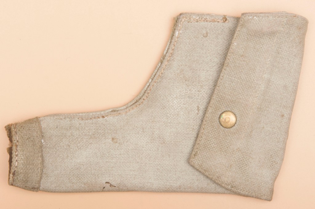 Grotendeels gewit (“blanco”) webbing, 160mm breed en 220mm hoog, dubbele 25mm brede riemlussen aan de achterkant, sluiting van boven naar beneden doorheen een messing beugel, messing beslag met 2 rivetten op het uiteinde van de flap en messing uiteinde van de sluitingsriem met 1 open rivet, 1 vak voor reservelader aan de binnenkant, met ruimte voor poetsstok.