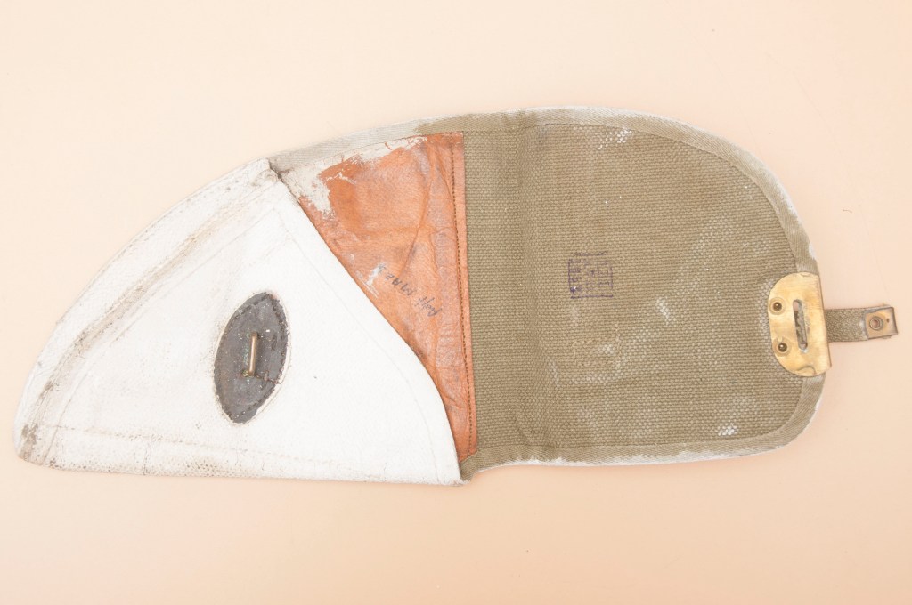 Gezwart webbing dat initieel groen was, 170mm breed en 220mm hoog, dubbele 25mm brede riemlussen aan de achterkant, sluiting van boven naar beneden doorheen een messing beugel, messing beslag met 2 rivetten op het uiteinde van de flap en messing uiteinde van de sluitingsriem met 1 open rivet, 1 vak voor reservelader aan de binnenkant, met ruimte voor poetsstok.