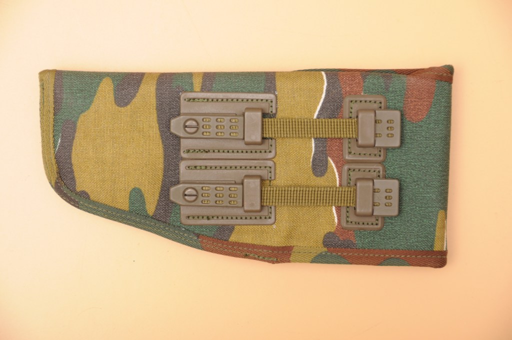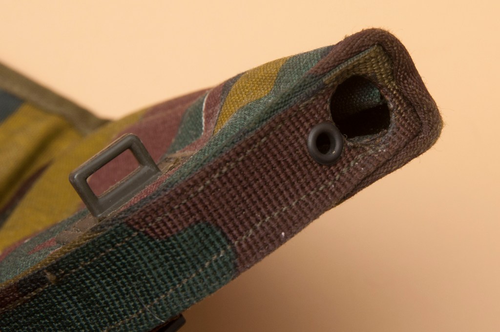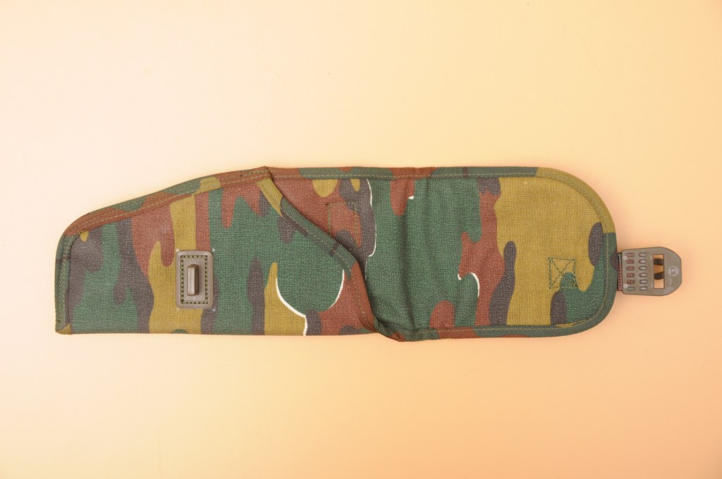 Stof in Belgisch Jigsaw camouflagepatroon, 160mm breed en 220mm hoog, dubbele 12mm brede lussen aan de achterkant, sluiting van boven naar beneden doorheen een kunststof beugel, kunststof op het uiteinde van de flap en kunststof uiteinde van de sluitingsriem met kliksysteem, 1 vak voor reservelader aan de binnenkant, met ruimte voor poetsstok.