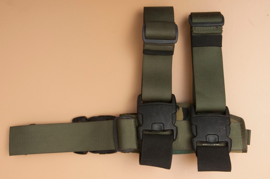 Stof in Belgisch Jigsaw camouflagepatroon, 115mm breed en 240mm hoog, dubbele 12mm brede lussen aan de achterkant, sluiting van boven naar beneden doorheen een kunststof beugel, kunststof op het uiteinde van de flap en kunststof uiteinde van de sluitingsriem met kliksysteem, geen vak voor reservelader aan de binnenkant, zonder ruimte voor poetsstok.