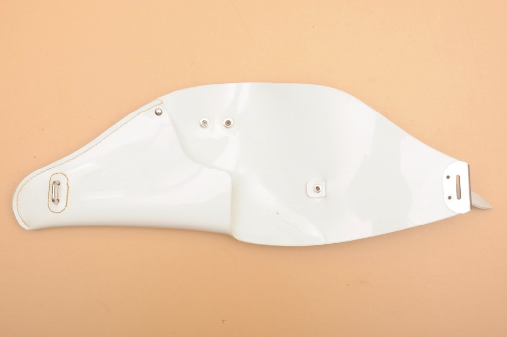 Wit kunststof, hard boxmodel, 165mm breed en 215mm hoog, dubbele 25mm brede riemlussen aan de achterkant, sluiting van boven naar beneden doorheen een stalen beugel die door een enkele opening in de flap past, 1 vak voor reservelader aan de binnenkant, met ruimte voor poetsstok.