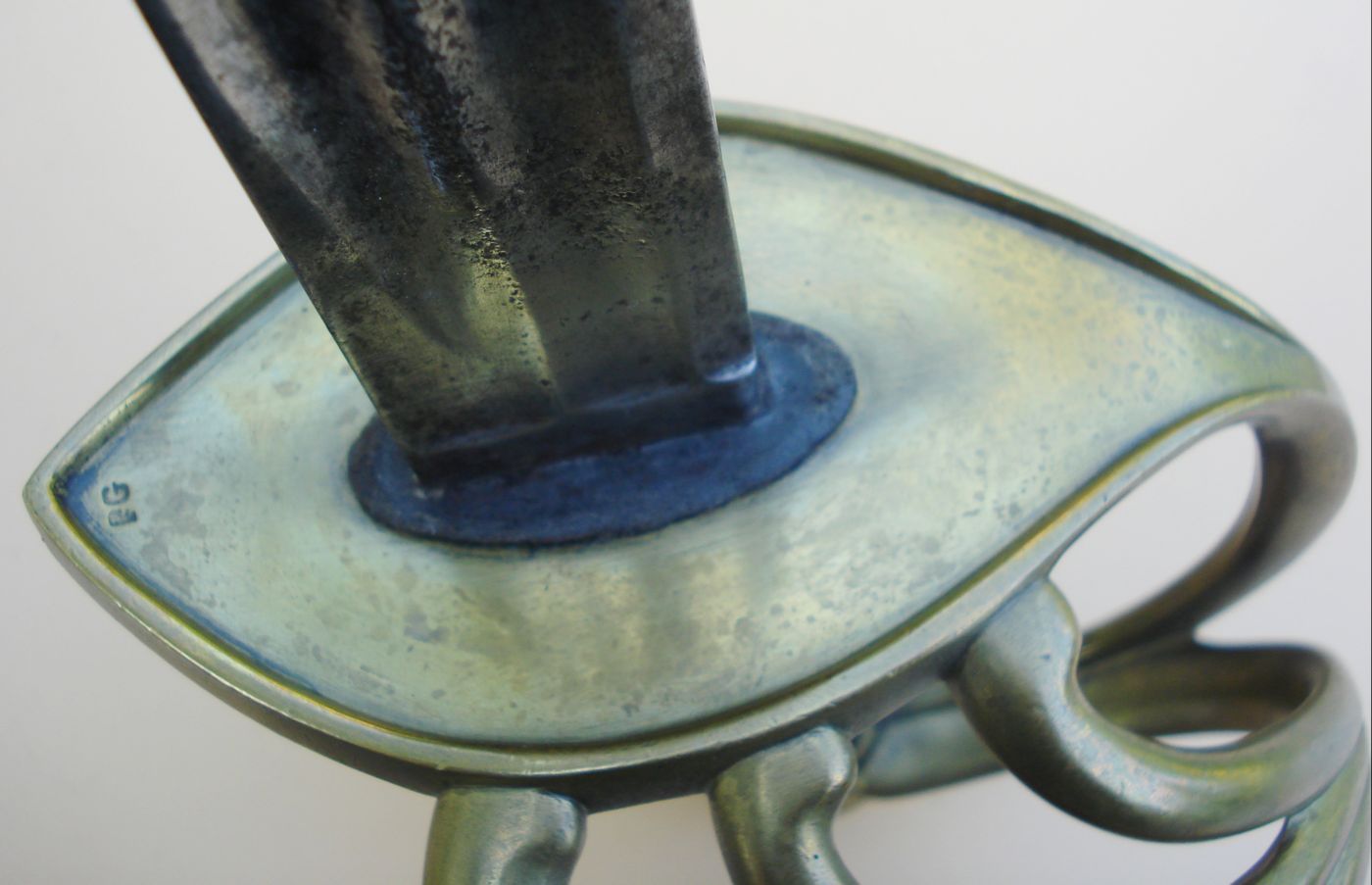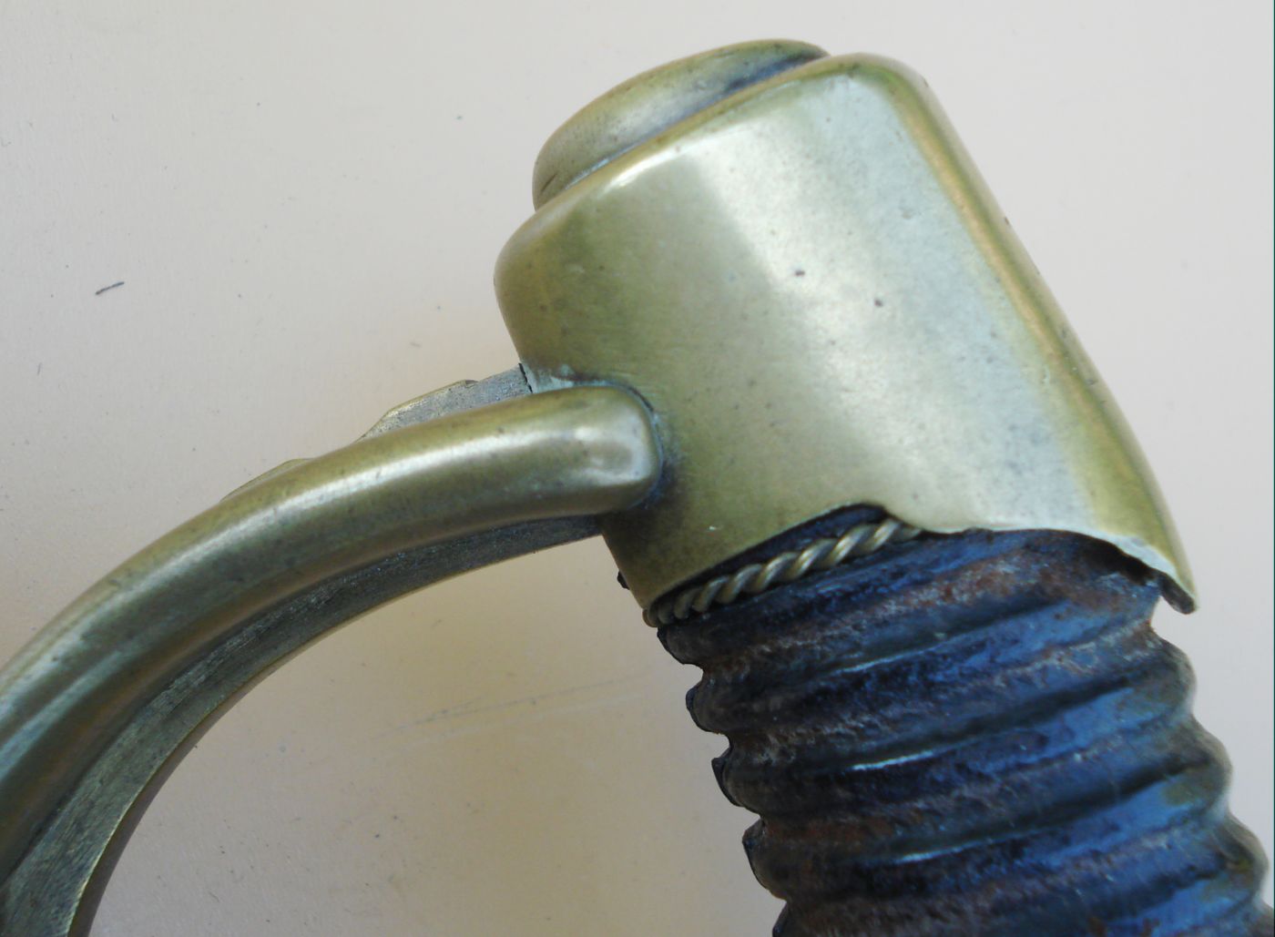 De stootplaat bestond uit een enkel stuk gegoten messing met 4 beugels waarvan de hoofdbeugel vooraan eindigde in een licht naar voren gebogen schelp met boord. Het handvat was gemaakt uit een houten fusée waarrond touw gedraaid werd en dan overspannen met koeleer. Hierrond werd messing filigraandraad 18 keer rond het handvat gewikkeld.