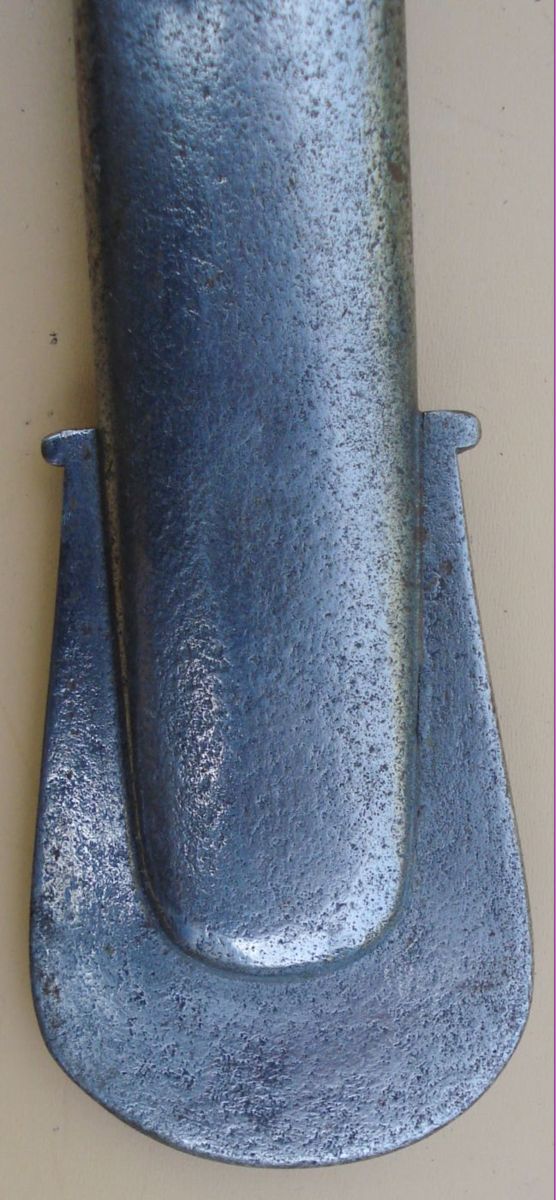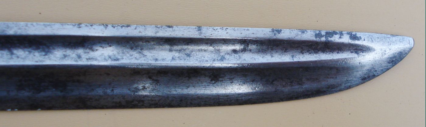 Het lemmet van 974mm was recht, enkelzijdig geslepen en met zowel een bloedgeul als een groef aan beide kanten. De tang was achteraan de greepkap platgeklopt.