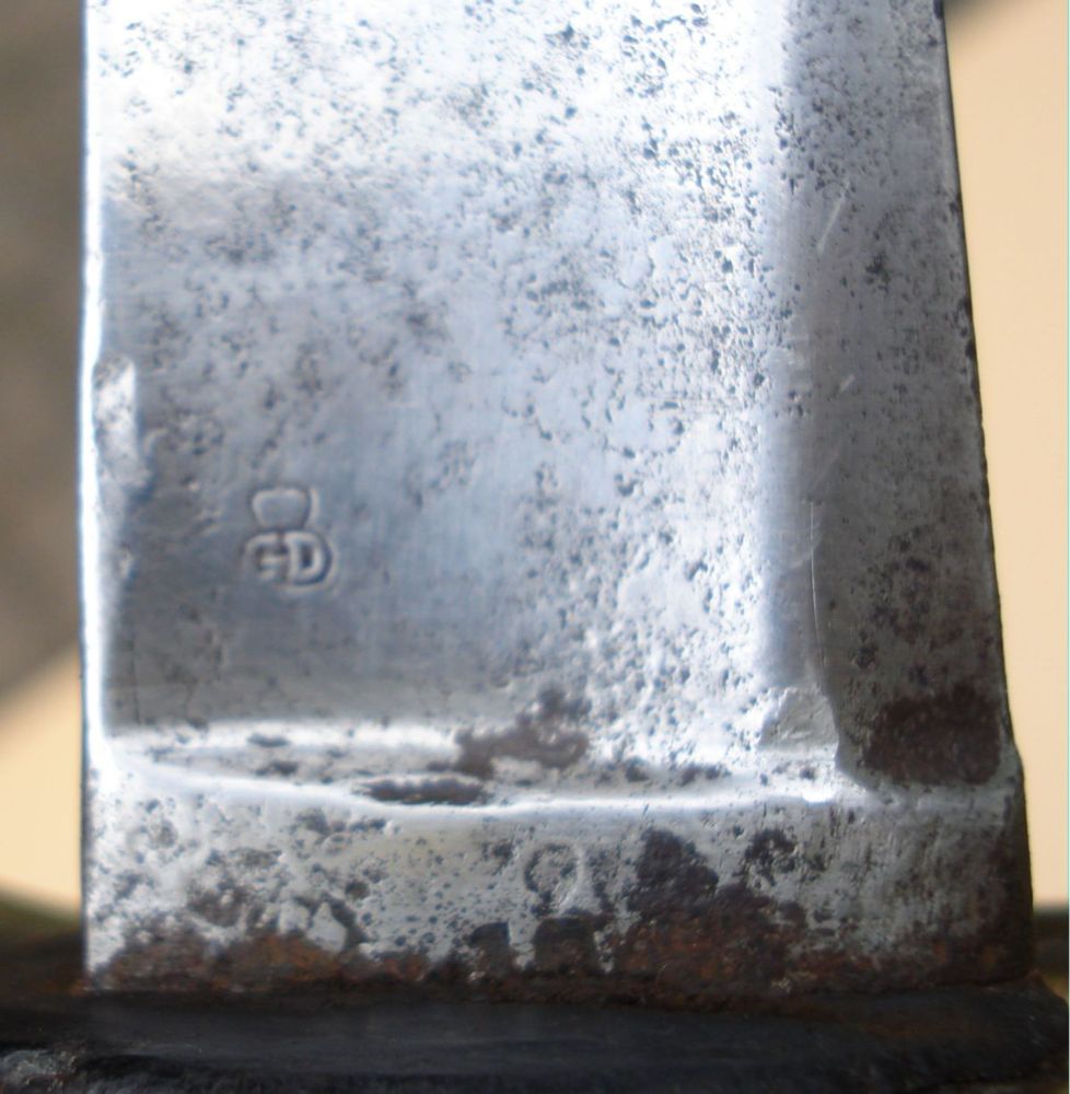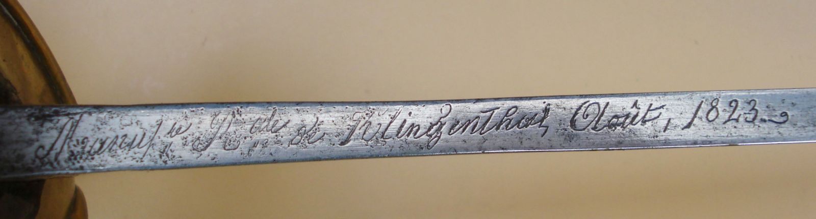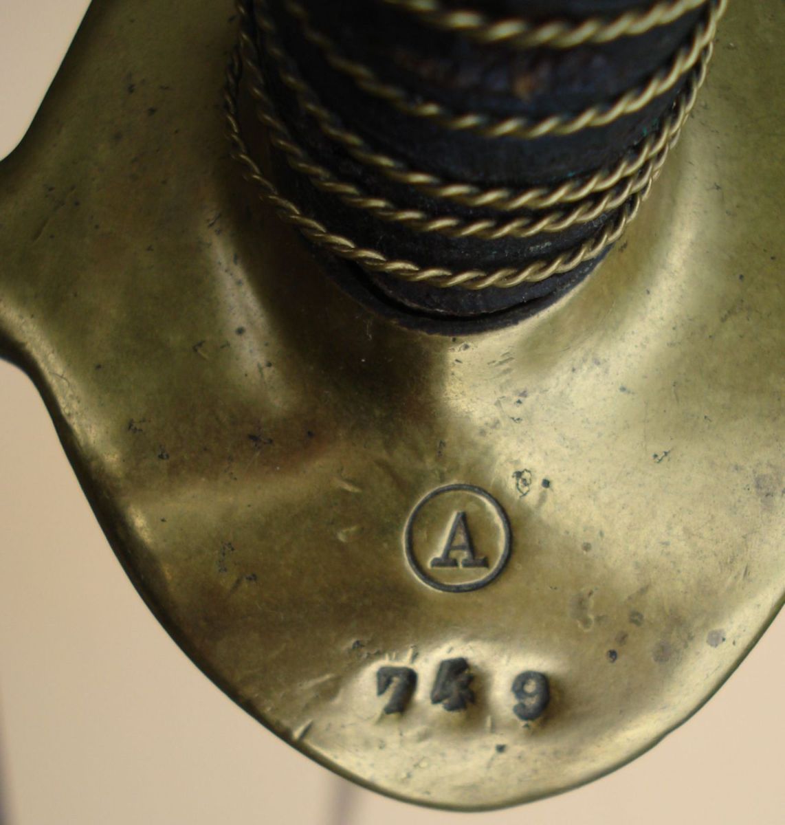 De stootplaat bestond uit een enkel stuk gegoten messing met 3 beugels waarvan de hoofdbeugel vooraan eindigde in een naar voren gebogen schelp met boord. Het handvat was gemaakt uit een houten fusée waarrond touw gedraaid werd en dan overspannen met koeleer. Hierrond werd messing filigraandraad 20 keer rond het handvat gewikkeld.