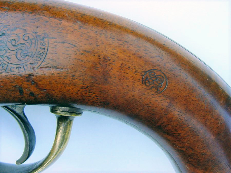 Achteraan liep de lade uit in een sterk afgeronde pistoolgreep met een messing greepkap die niet voorzien was van een stalen ring. Het pistool werd gedragen aan de riem, vandaar de riemhaak die op zijn plaats gehouden werd door een schroef van het mechanisme.