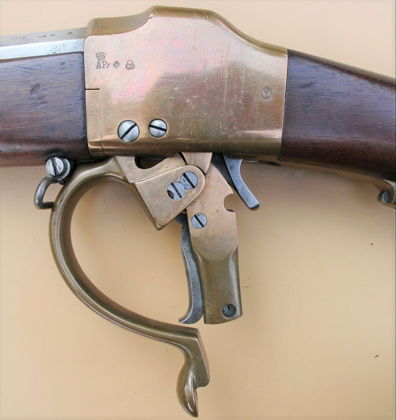 De trekkerbeugel, die tevens dienst deed als hefboom voor het herladen, het grendelblok en het grendelhuis waren gemaakt uit fosforbrons. Deze legering van koper, tin en fosfor was relatief makkelijk te gieten.