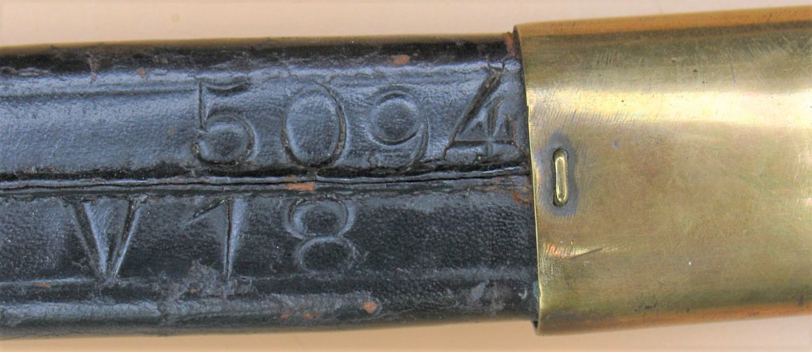 De schede was gemaakt uit gezwart koeleer afgewerkt met een messing mondstuk waarop een beugel voor het riempje van de koppelschoen geplaatst werd. De messing schedepunt had bovenaan een rechte boord.