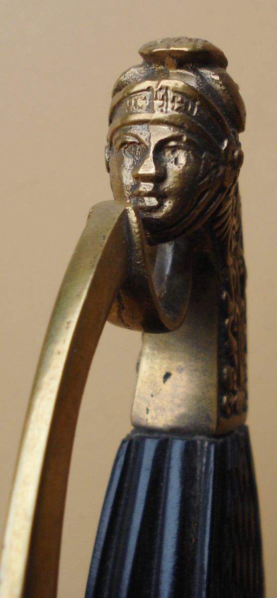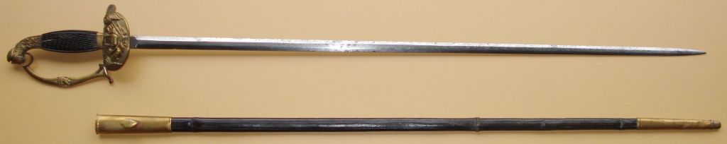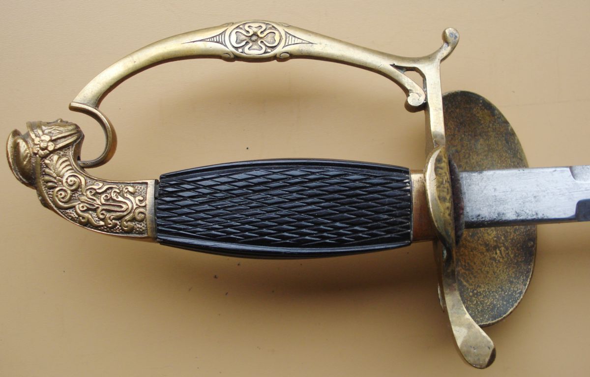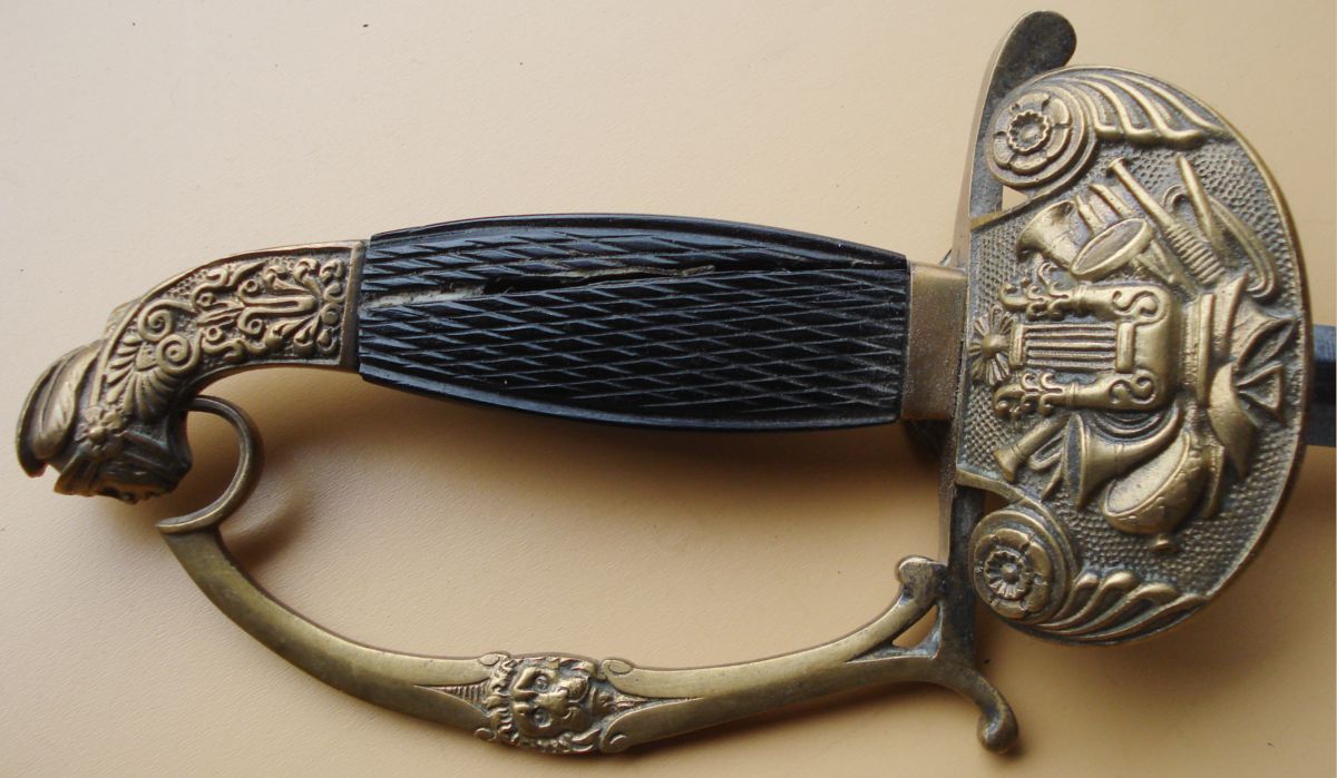 Het heft bestond uit een twee stukken gegoten messing. De garde had een enkele beugel, met een decoratieve leeuwenkop in het midden, die vooraan eindigde in een naar voren gebogen pareerstang met knop. De garde beschikte vooraan ook over een decoratieve schelp met bloemenmotieven en instrumenten als een lier, hoorn, trompet en tamboer. De pommel was ook in de vorm van het hoofd van Minerva.