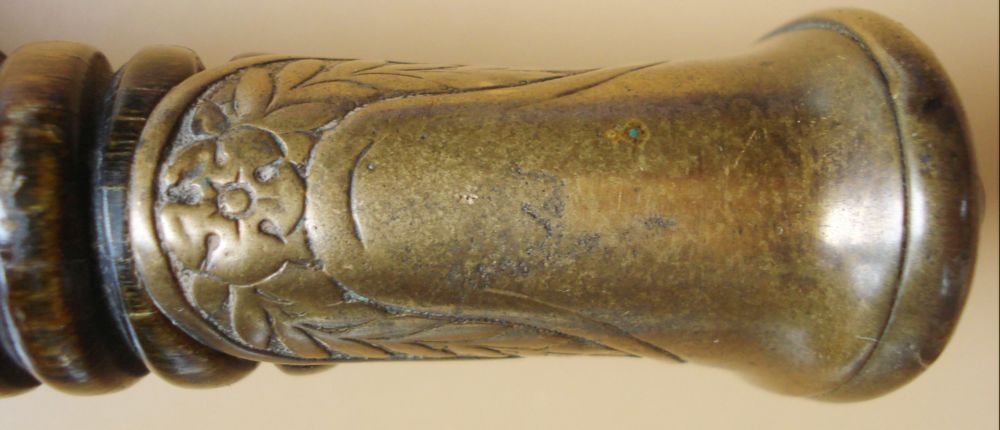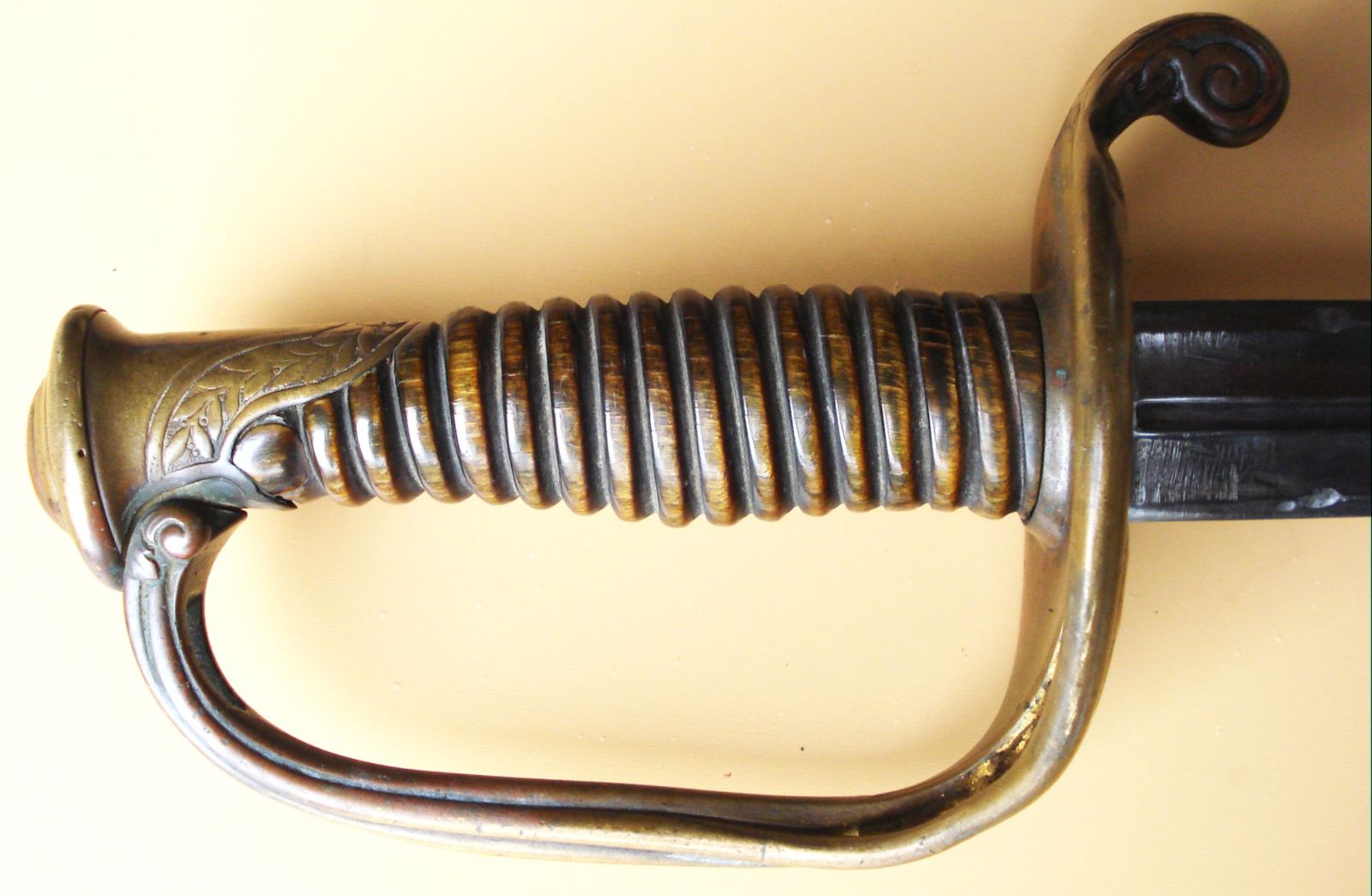 Het handvat was identiek aan dat van het sabel voor lager infanterieofficier model 1850 met een stootplaat die bestond uit een enkel stuk gegoten messing met 1 beugel die vooraan eindigde in een naar voren gebogen schelp met boord. Het handvat was gemaakt uit een hoorn fusée waarrond messing filigraandraad 16 keer rond werd gewikkeld.