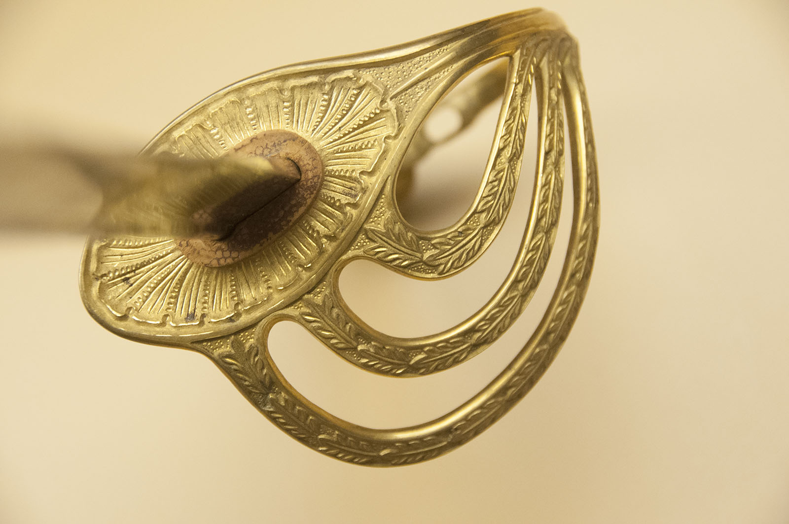 De stootplaat bestond uit een enkel stuk gegoten messing met 4 beugels waarvan de hoofdbeugel vooraan eindigde in een licht naar voren gebogen schelp met boord. Het handvat was gemaakt uit een houten fusée met een messing filigraandraad die er 13 keer rond werd gewikkeld.