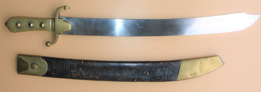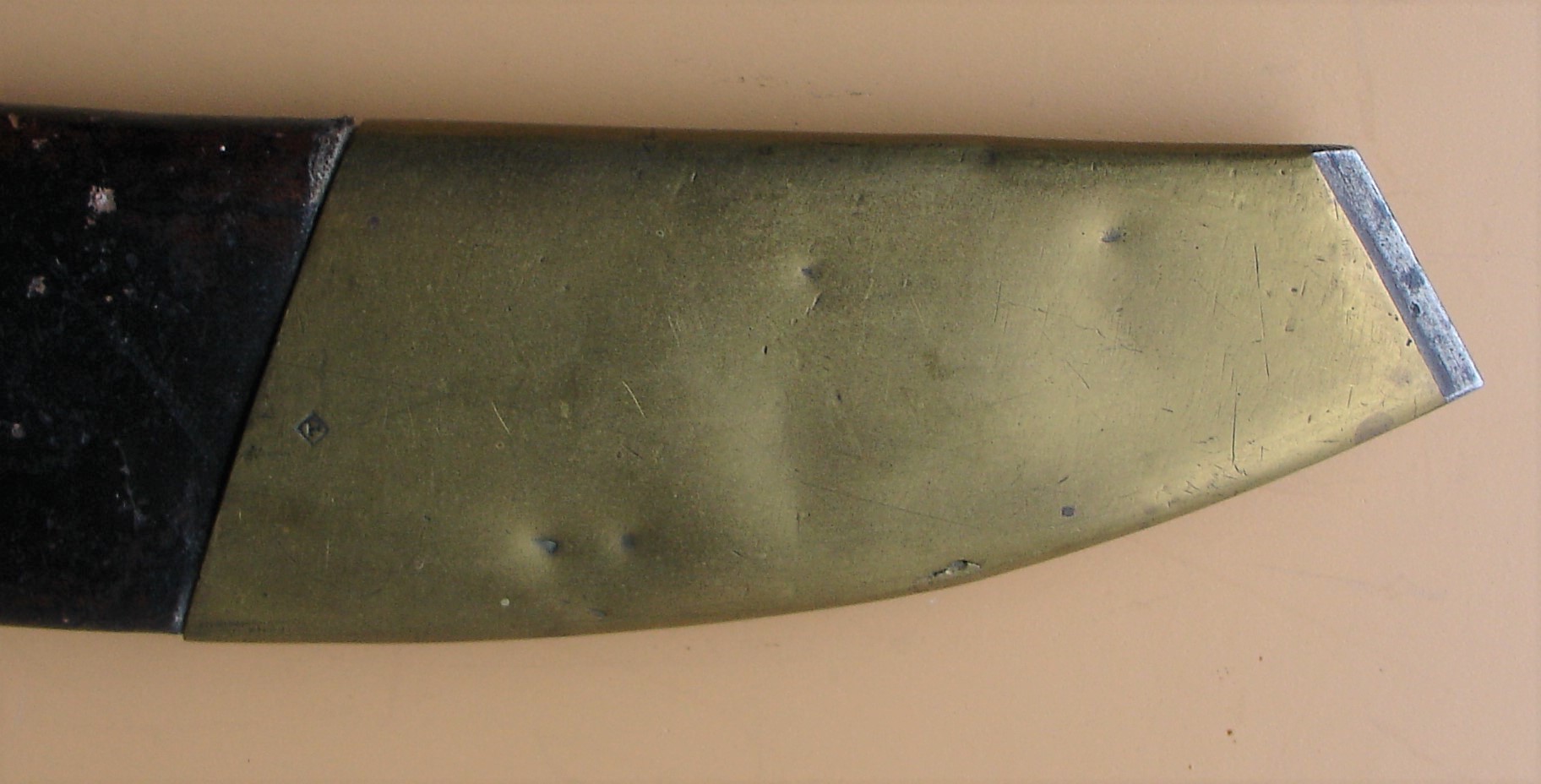 Het lemmet van 500mm was licht gekromd, enkelzijdig geslepen en zonder bloedgeul. De punt is van het Bowie-type. De tang was achteraan het heft platgeklopt en door het heft bevestigd met twee stalen rivetten in een decoratieve halve bol. Een derde, puur decoratieve messing bol bevond zich achter de 2 functionele.